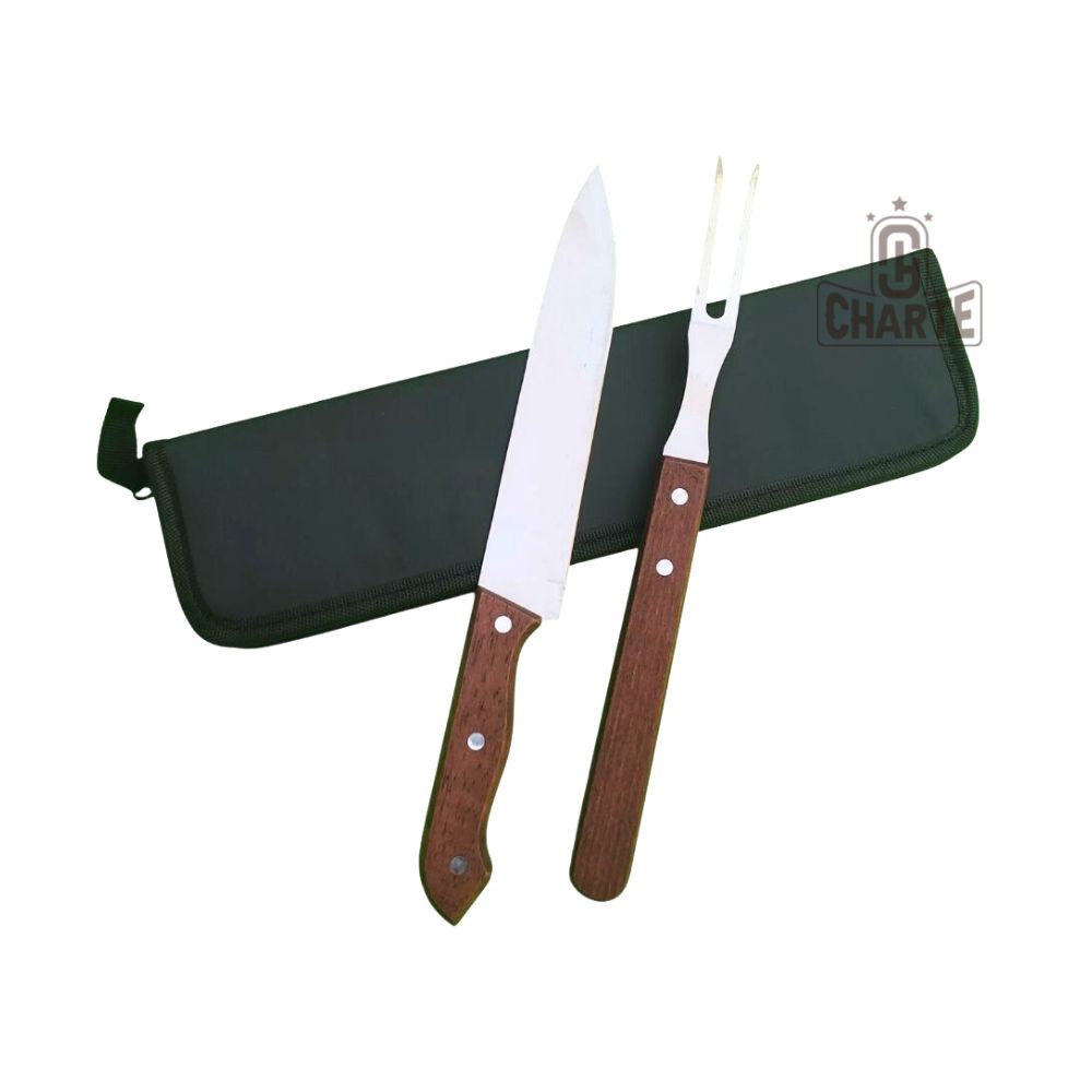 Kit Churrasco Tábua de Carne Madeira Estojo Faca e Garfo Conjunto Churrasqueiro