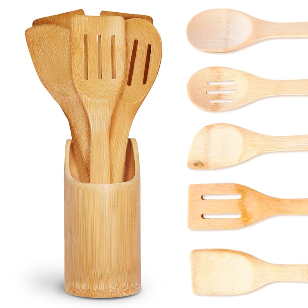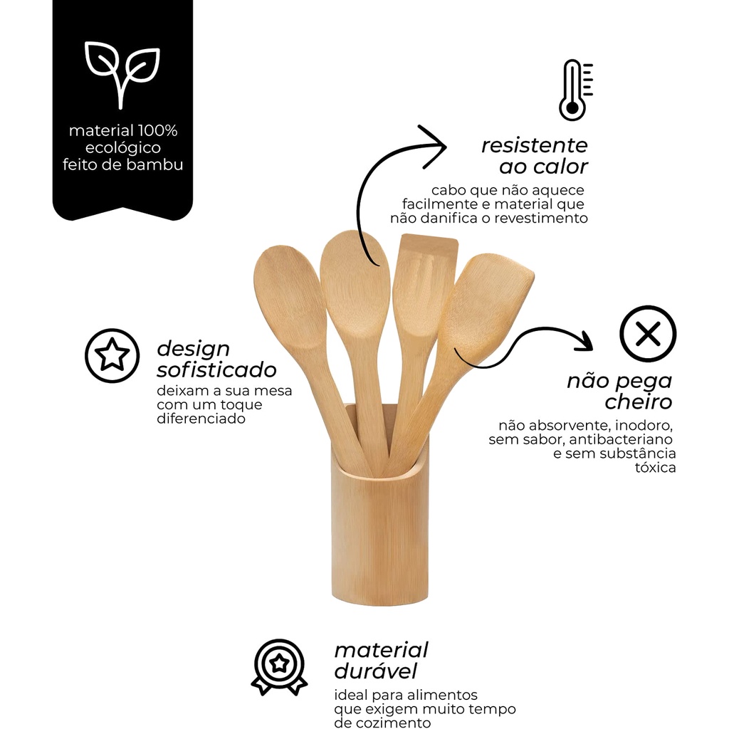 Kit Colher De Pau Utensílios Em Bambu 5 Peças com Suporte