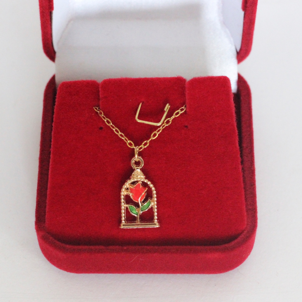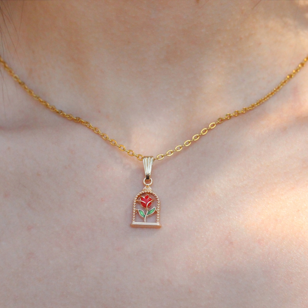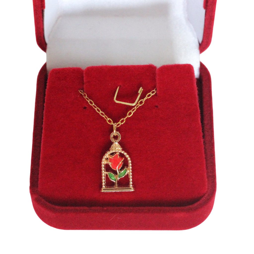 Colar Rosa Encantada na Cúpula Aço Inoxidável | Presente Bela e a Fera + Caixinha de Veludo Vermelha