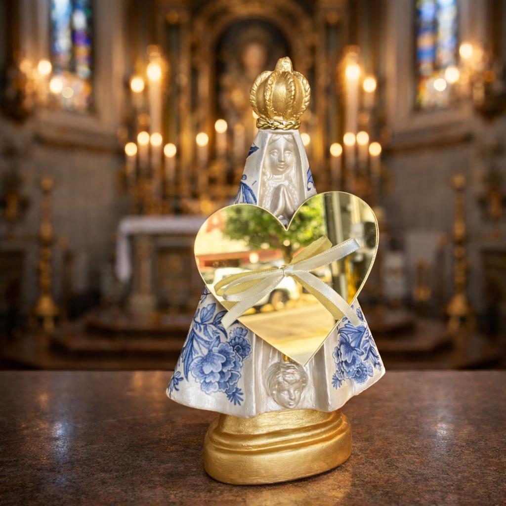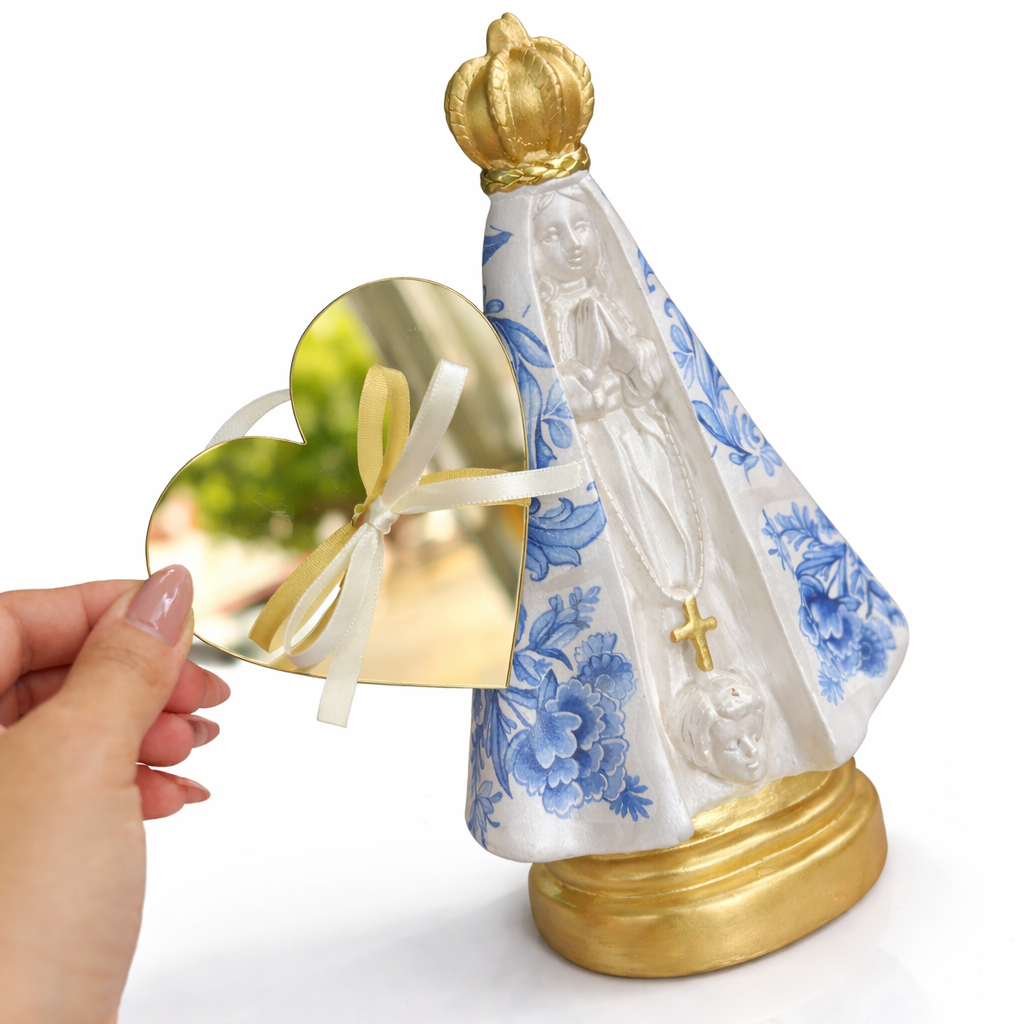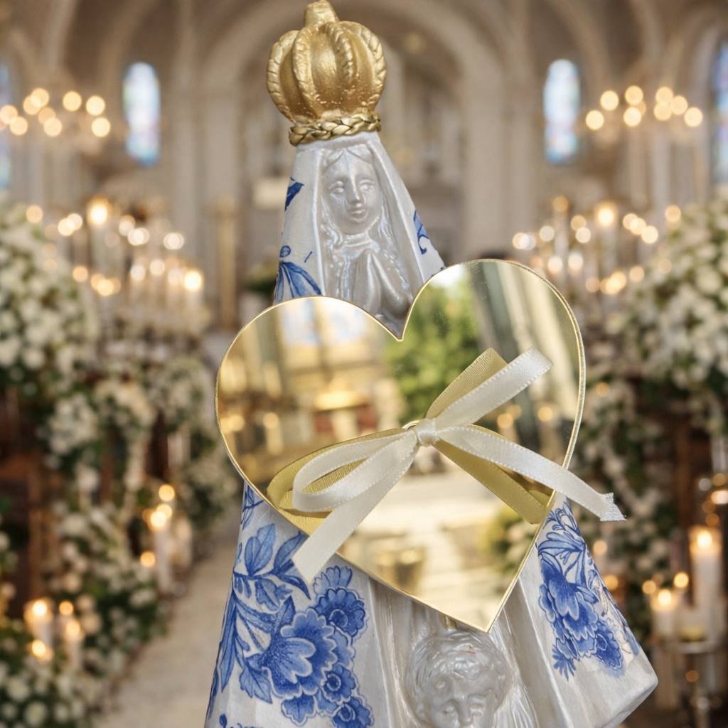 Porta Alianças Católico Nossa Senhora Aparecida em Gesso com Acrílico Dourado Feito a Mão Único