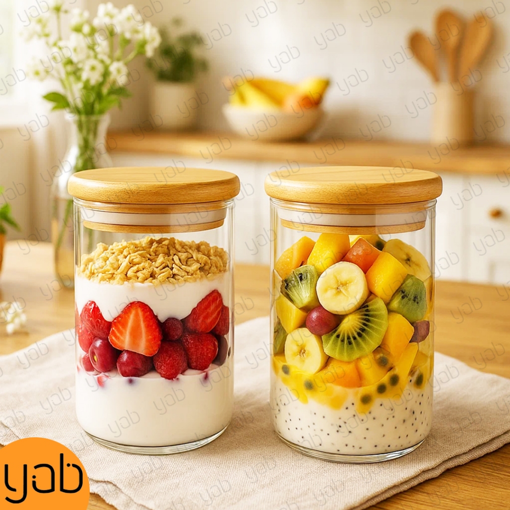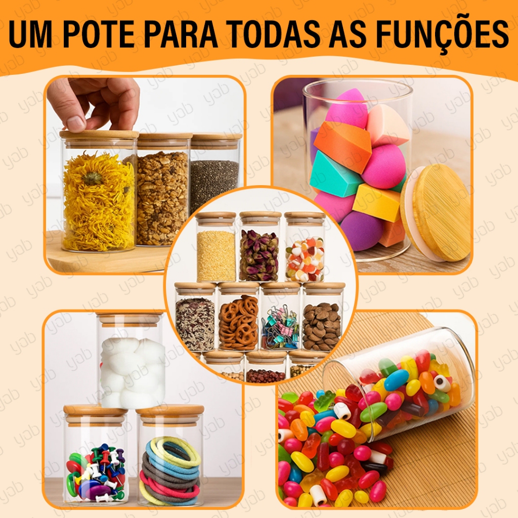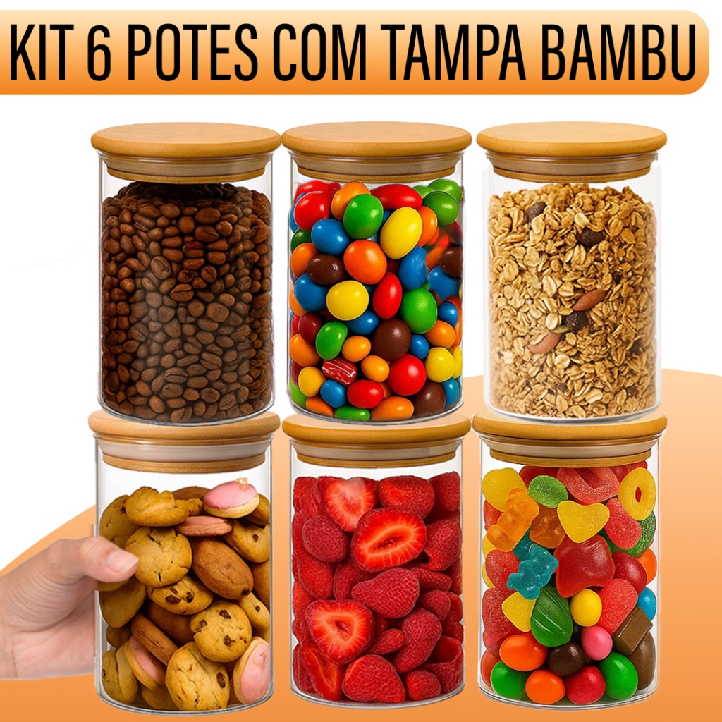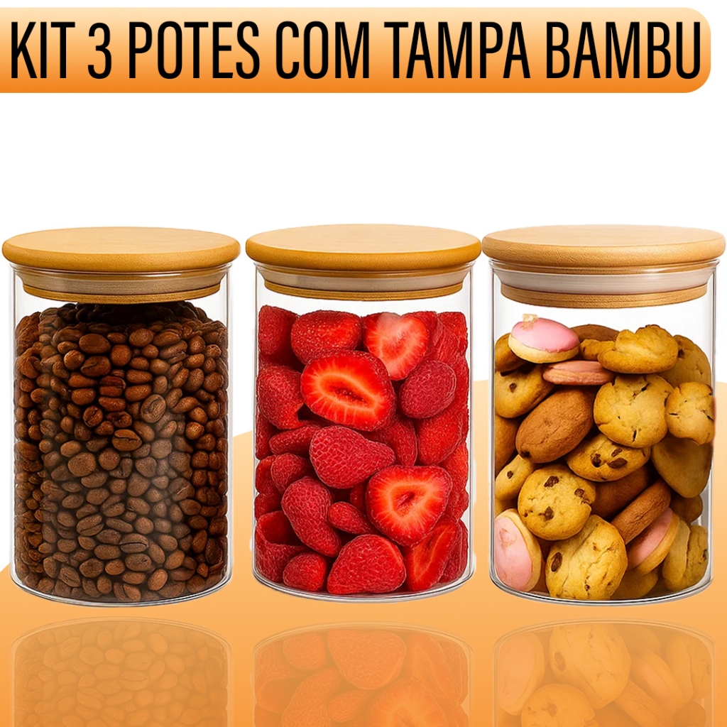 Kit 3 Pote com Tampa Bambu 600ml Vidro Hermético Yab Para Alimentos Condimentos