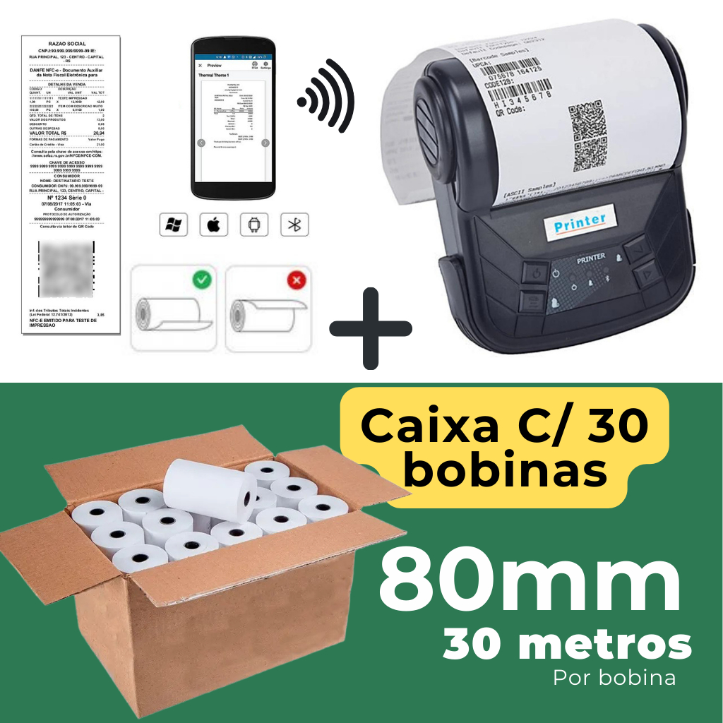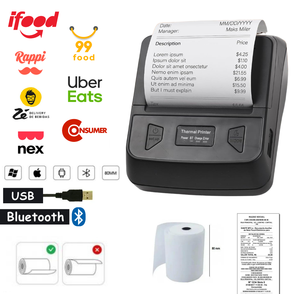 Impressora Térmica 80mm De Recibos Bluetooth e USB, Bilhetes Portátil Para Restaurante Supermercado Negócios