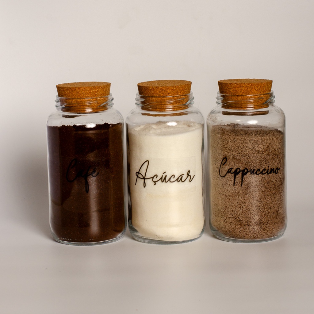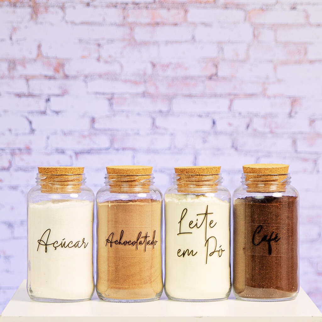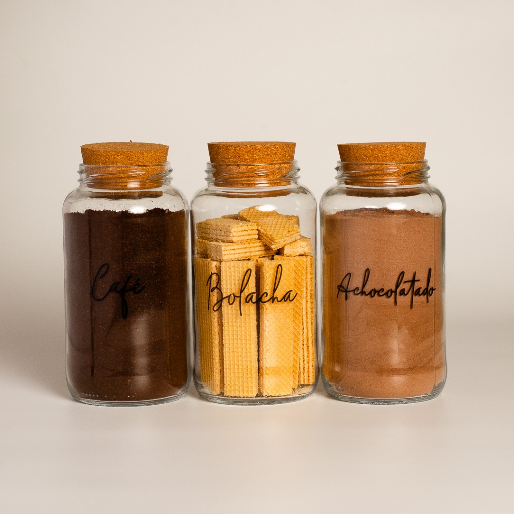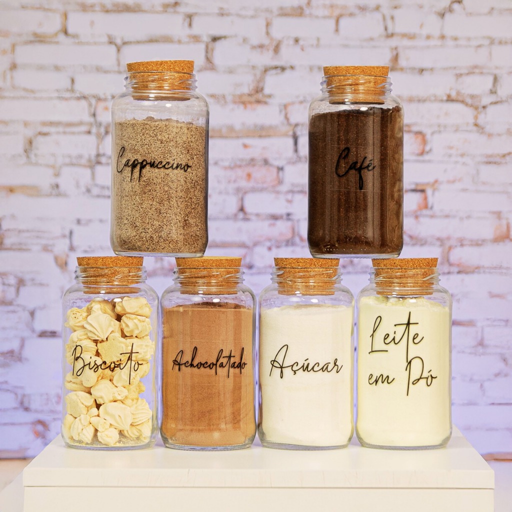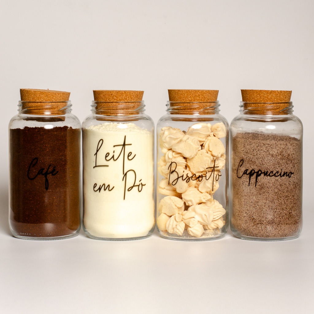 Kit Cantinho do Café - ESCOLHA SEU KIT - Potes de Vidro 830 ml com Tampa de Cortiça + Adesivos