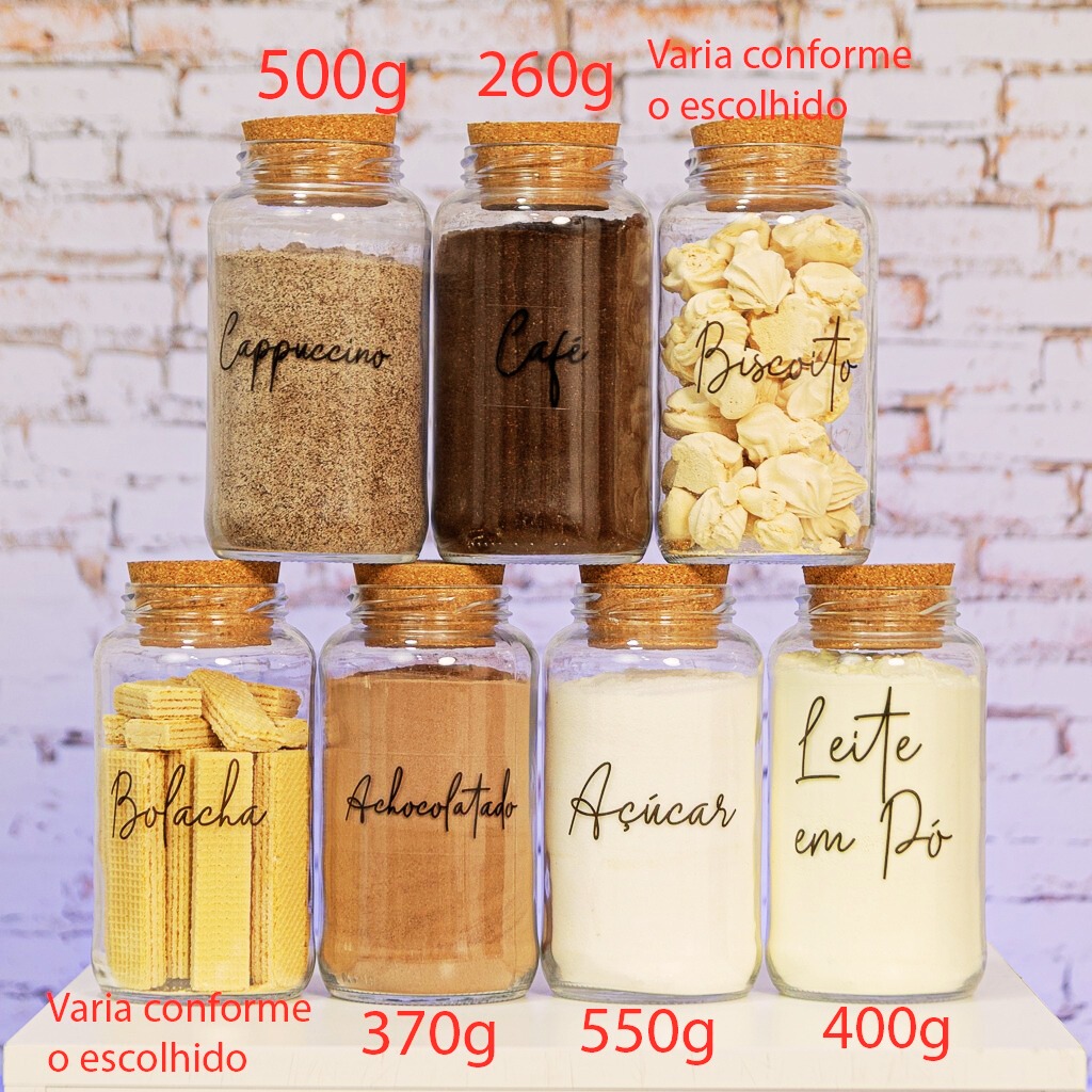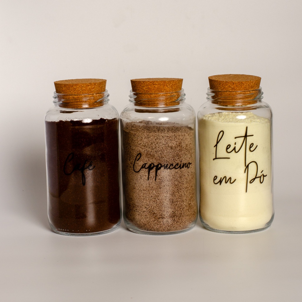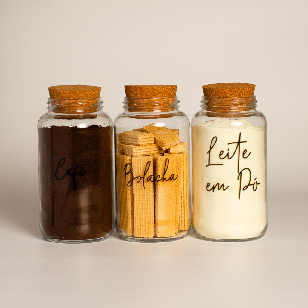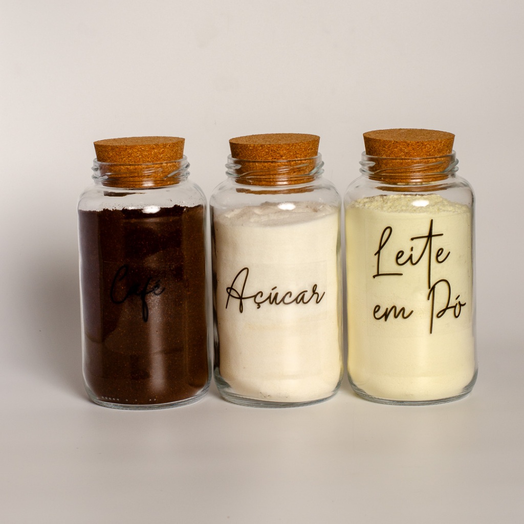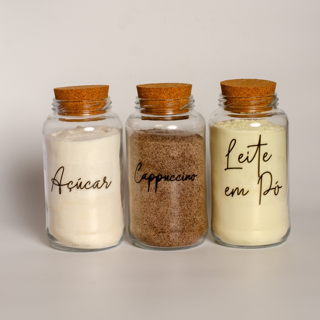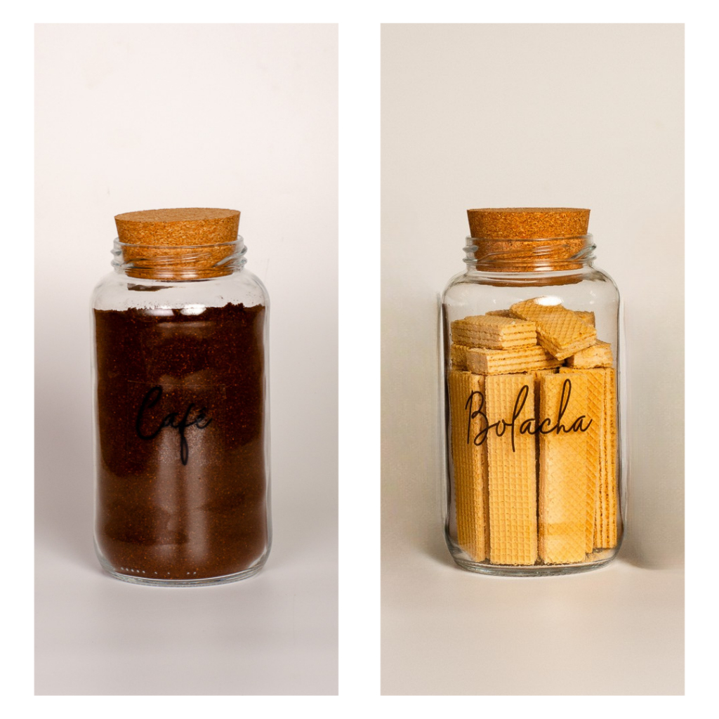 Kit Cantinho do Café - ESCOLHA SEU KIT - Potes de Vidro 830 ml com Tampa de Cortiça + Adesivos