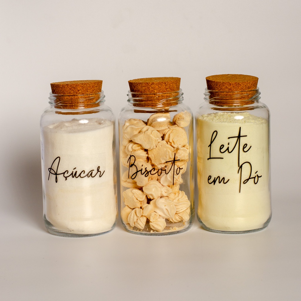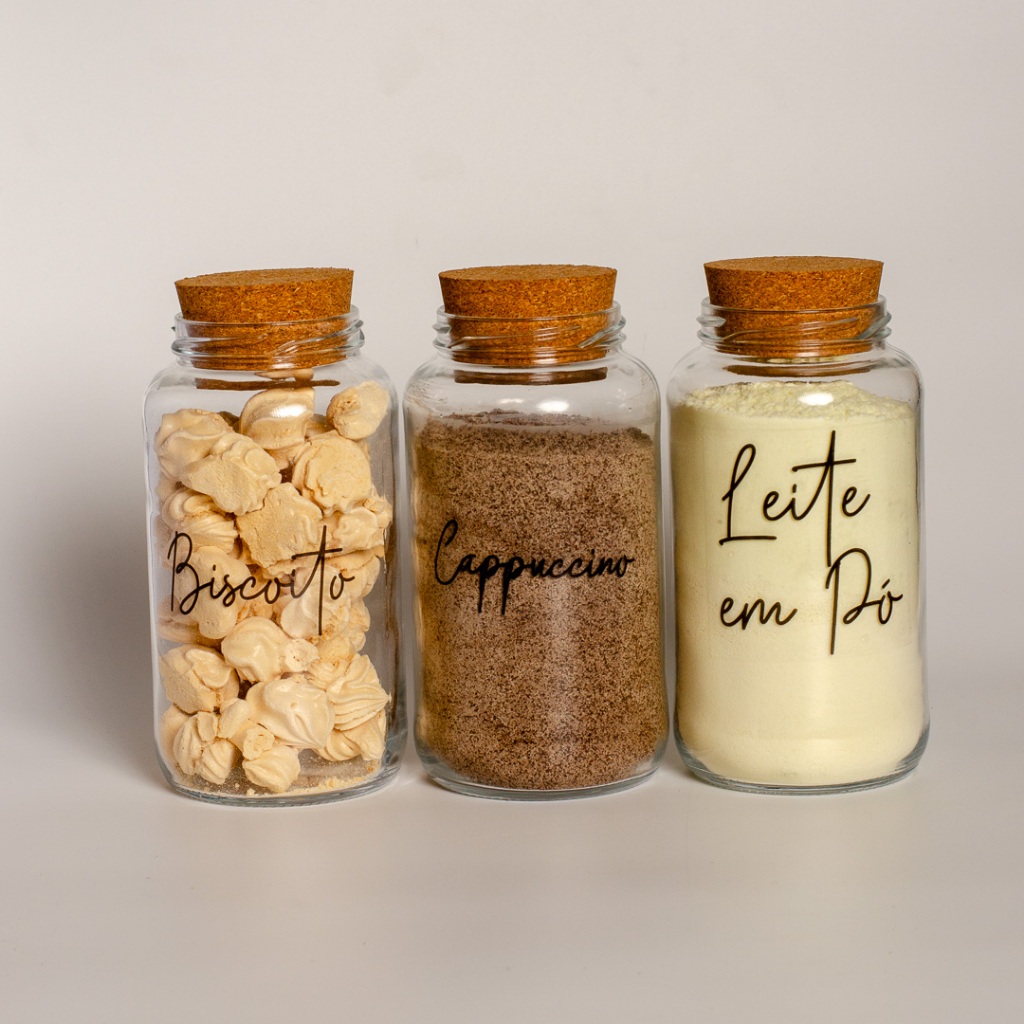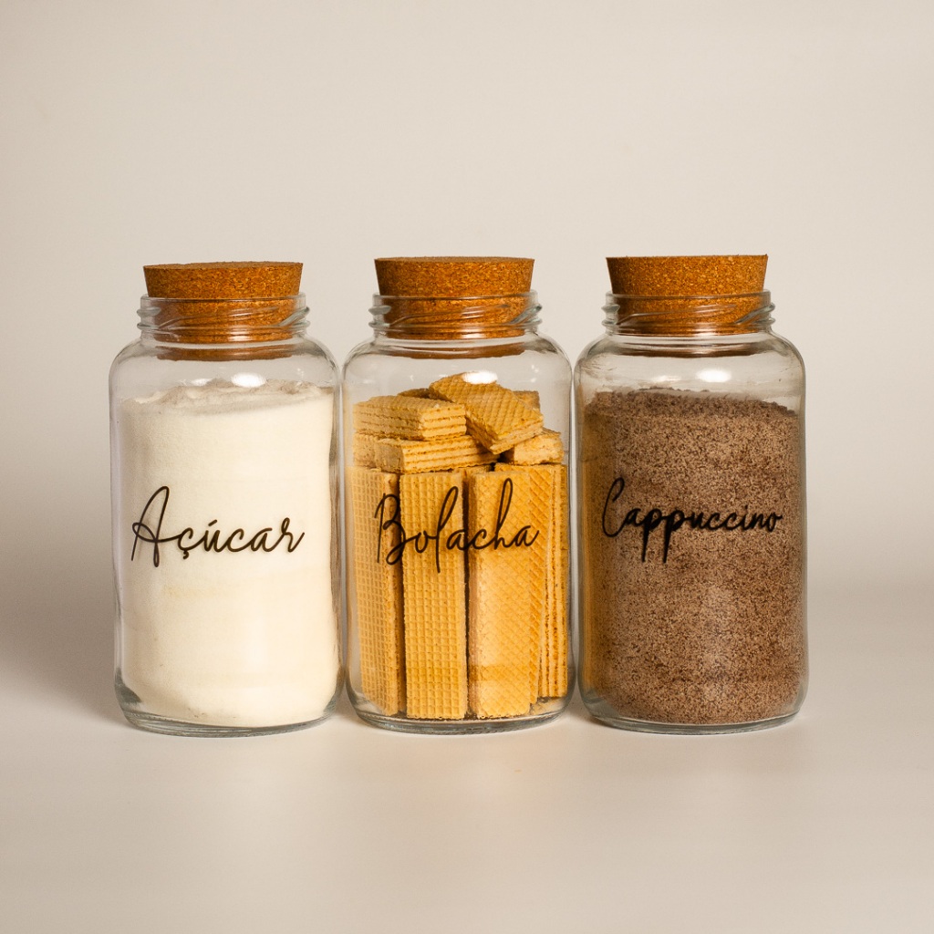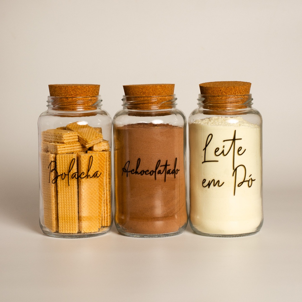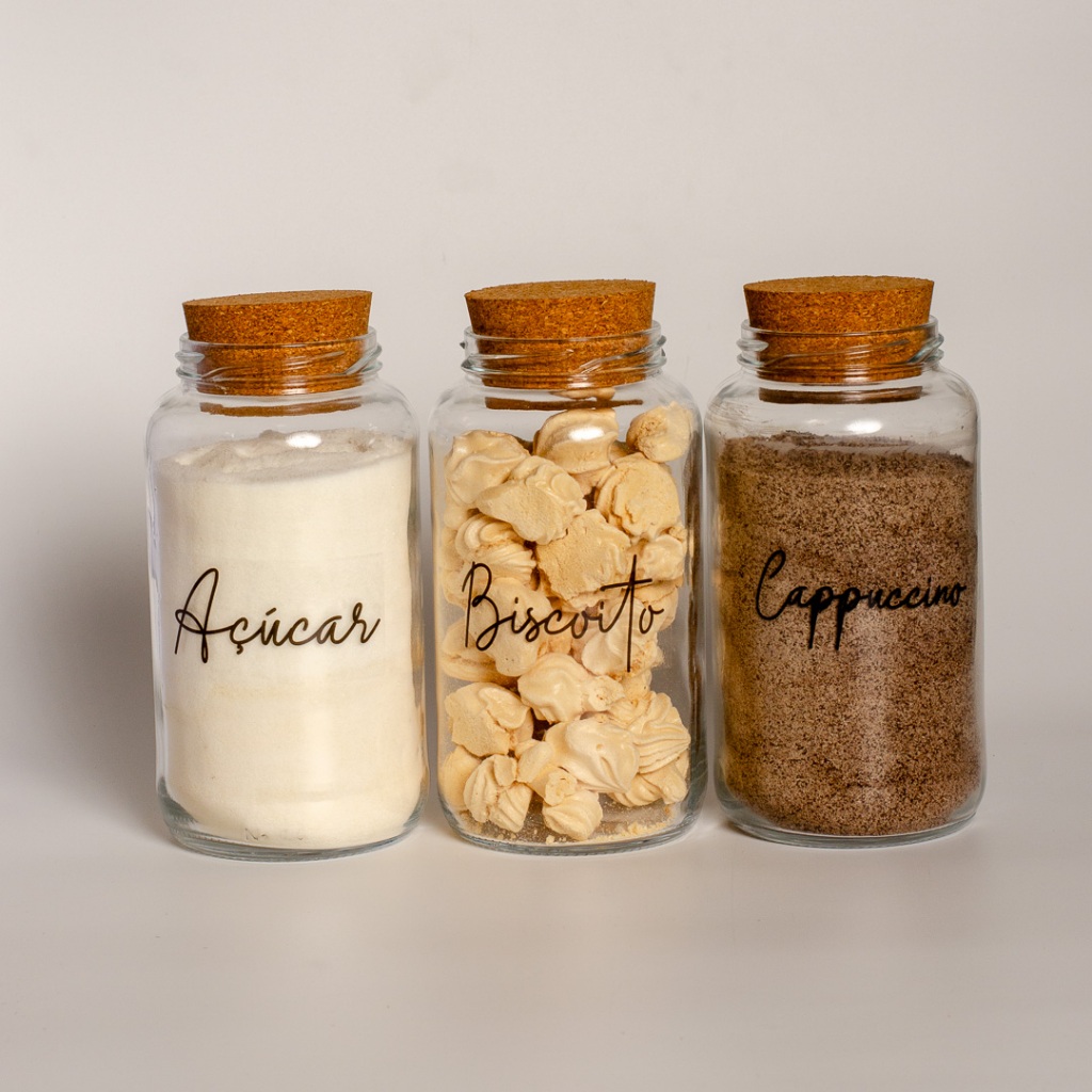 Kit Cantinho do Café - ESCOLHA SEU KIT - Potes de Vidro 830 ml com Tampa de Cortiça + Adesivos