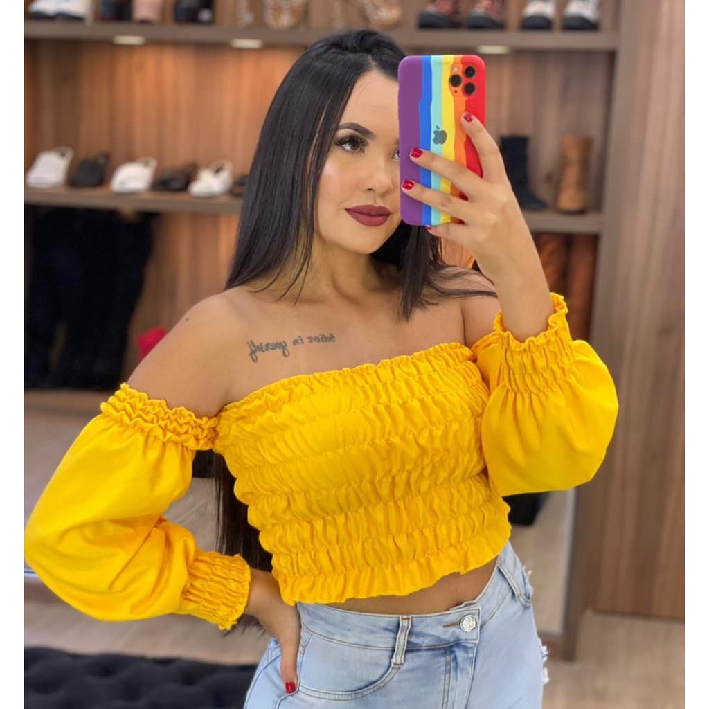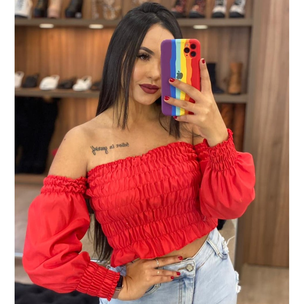 Blusa Cropped Lastex Ombro á Ombro com manga longa Franzido Franzidinho última moda
