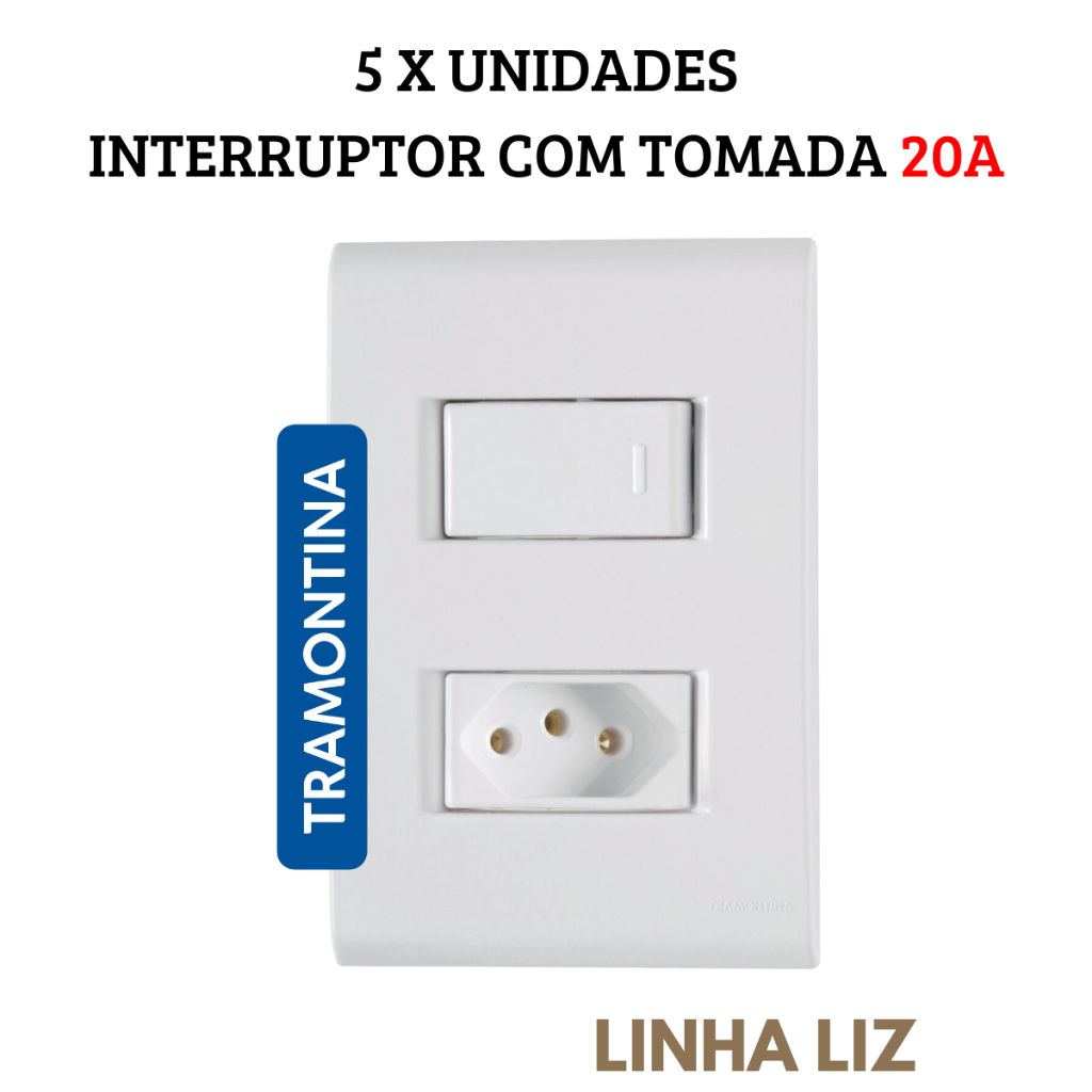 5 x Interruptor 1 Tecla com Tomada 20A Tramontina LIZ Placa 4x2 de Embutir