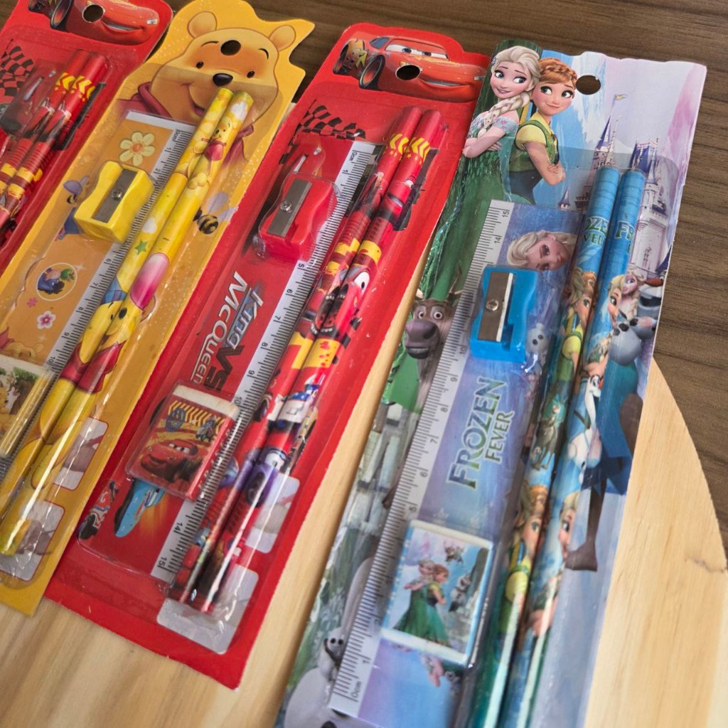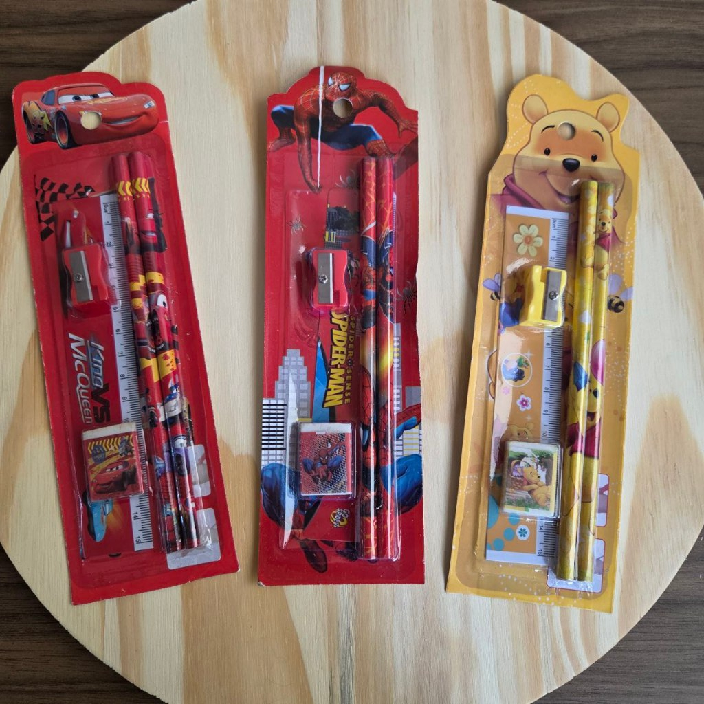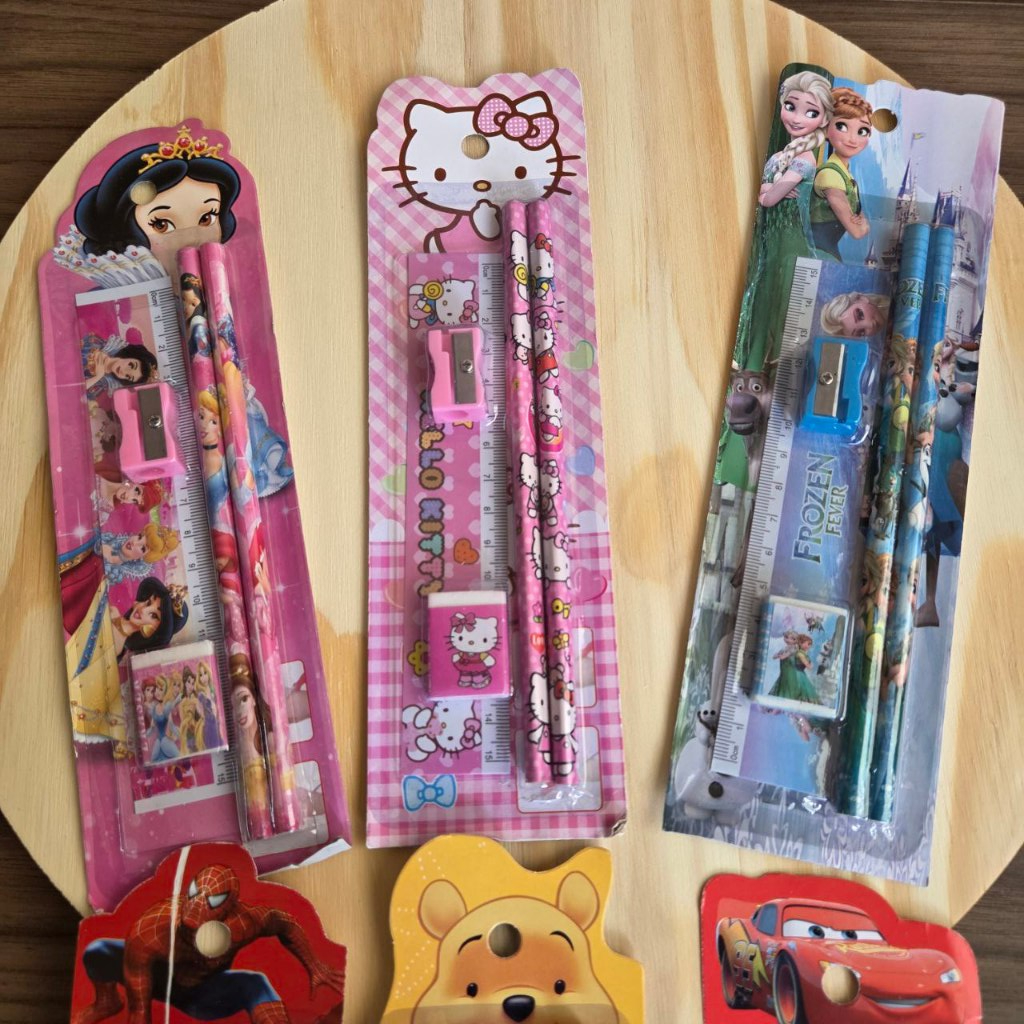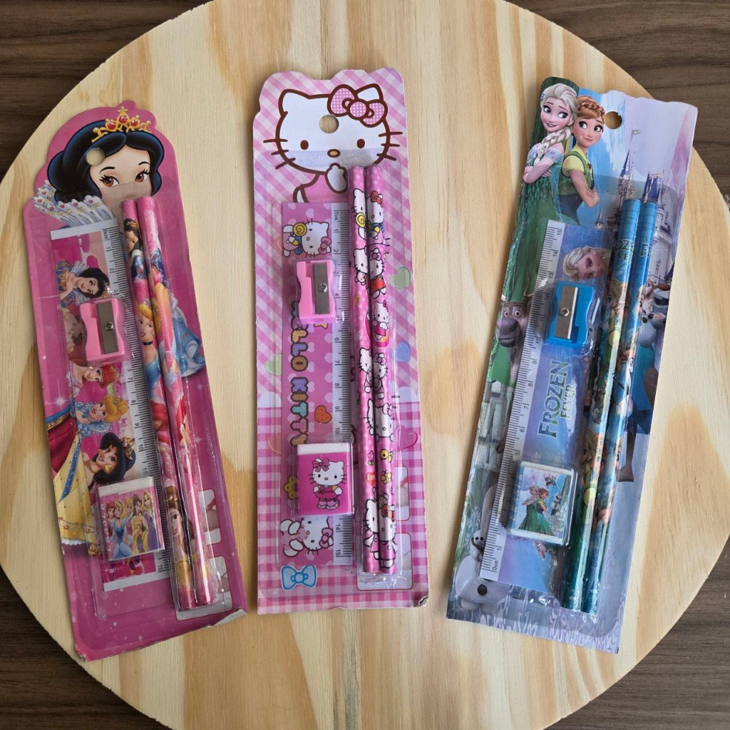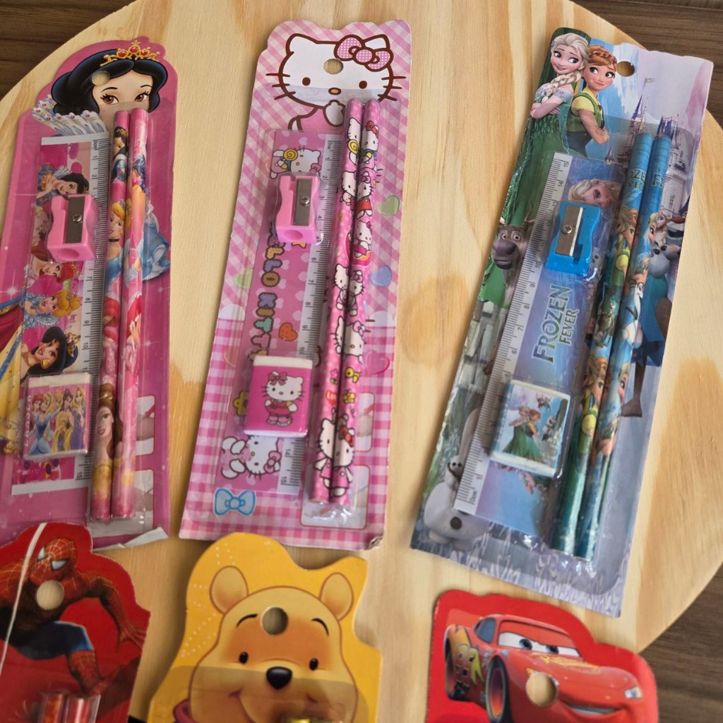 Kit Lápis + borracha+ apontador+regua Hello Kitty , homem aranha, frozem, ursinho pooh , carros, princesas