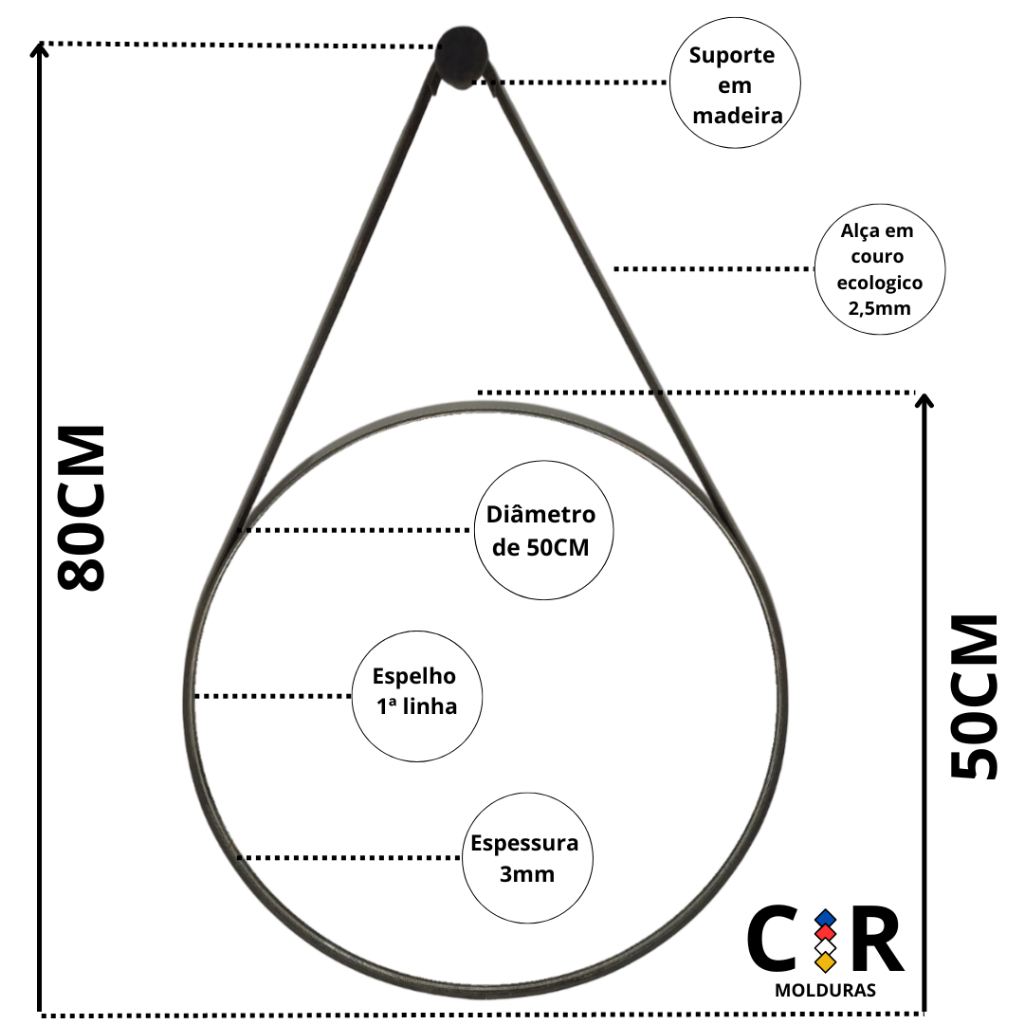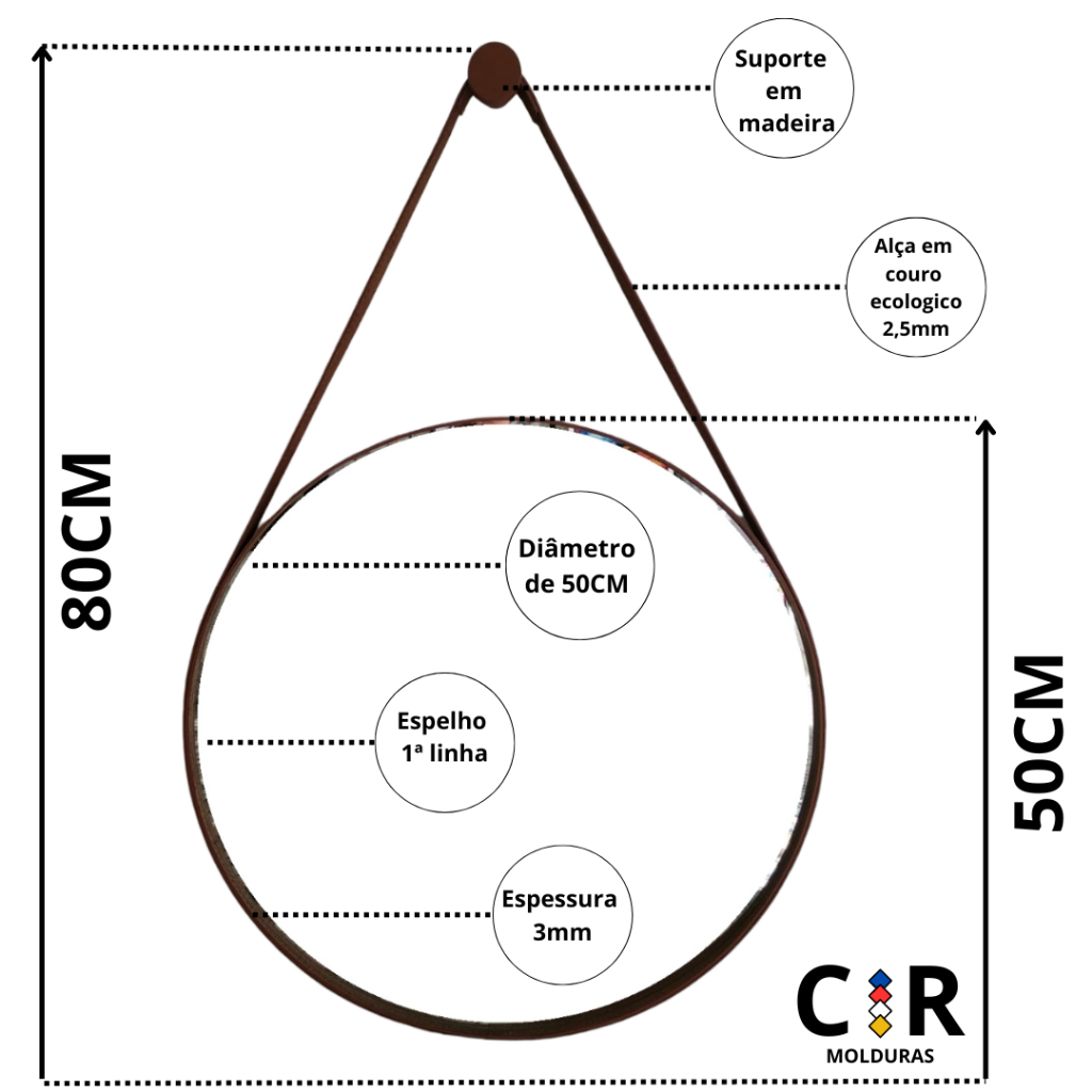 Espelho Decorativo Redondo 50cm Adnet Suspenso C/ Alça Couro Ecológico + 5 Anos de Garantia