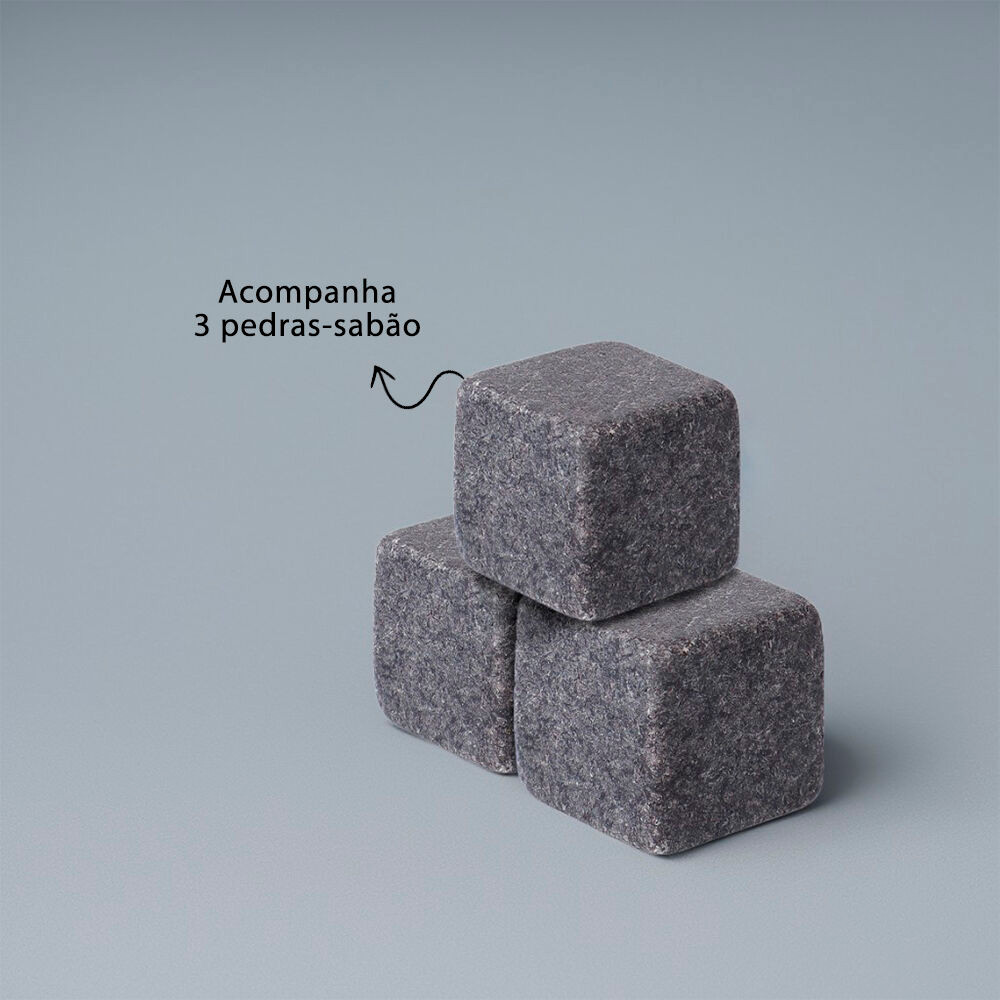Kit Copo para Whisky + Pegador de Gelo + 3 Cubos de Pedra-sabão e Caixa de Madeira