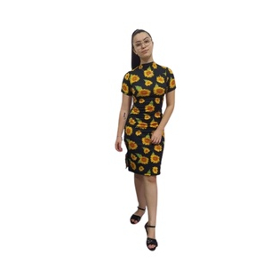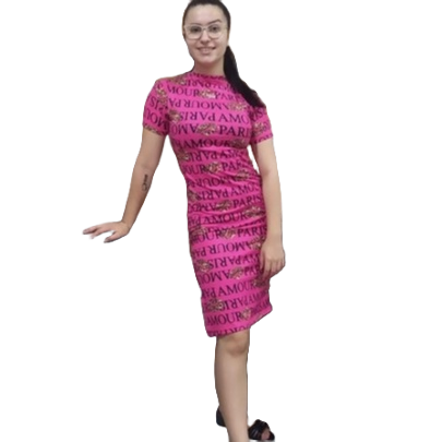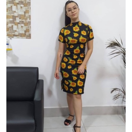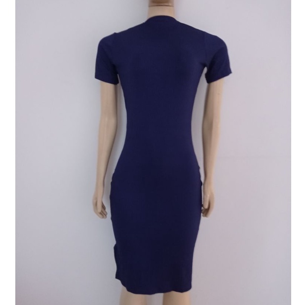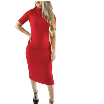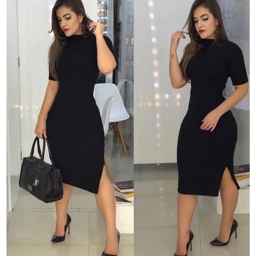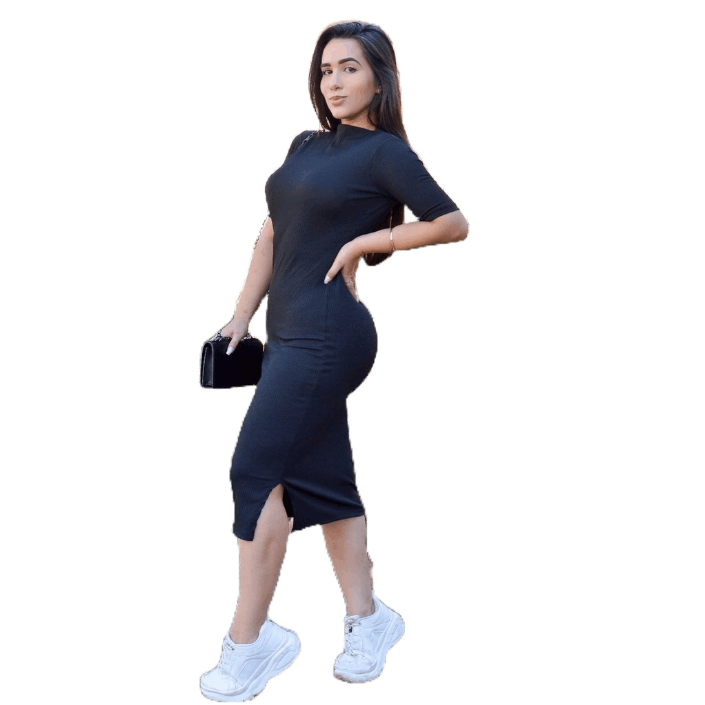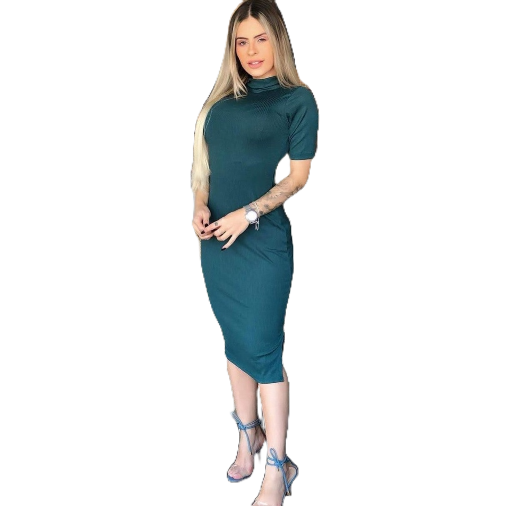 Vestido Canelado Midi Manga Curta Com Fenda Lateral De Um Lado Gola Alta