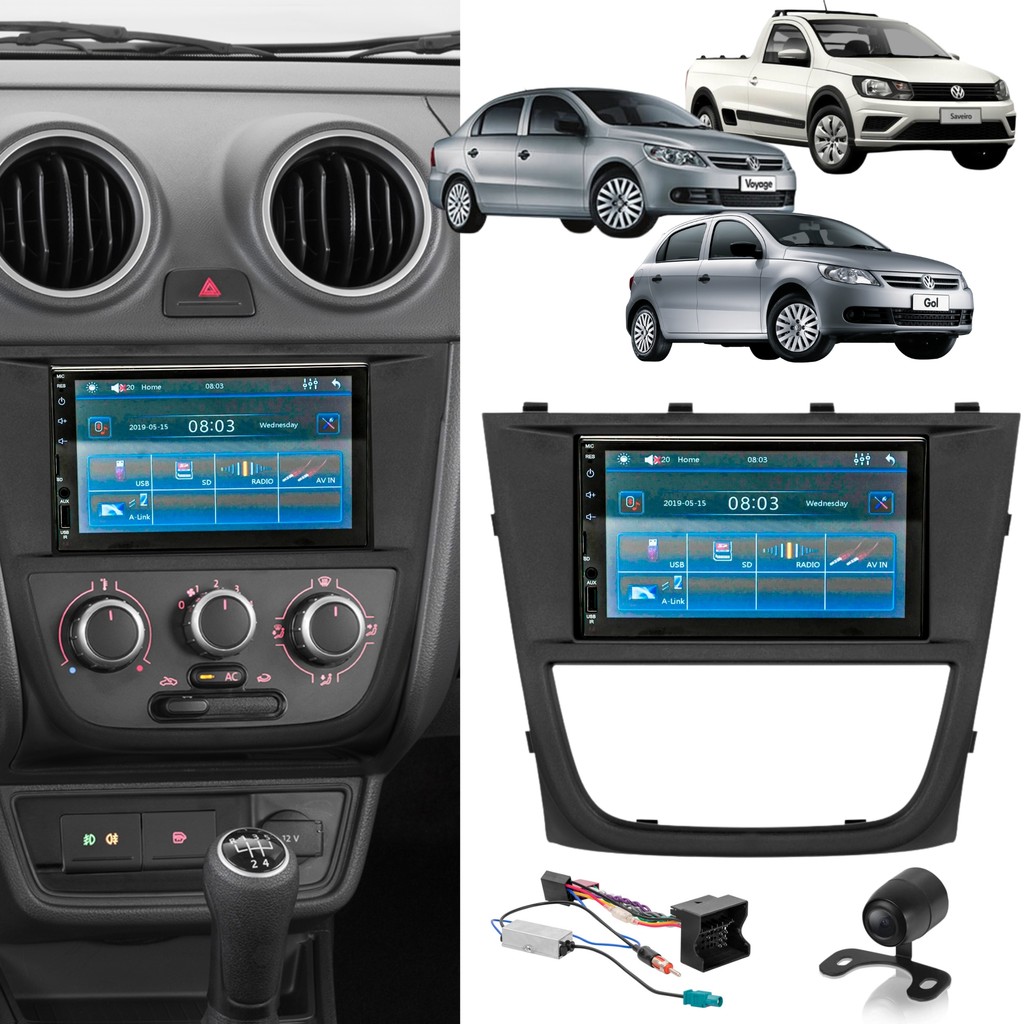 Kit Gol G5 Central Multimídia MP5 2DIN 7" BT SD USB Espelhamento + Câmera Ré Moldura Chicotes