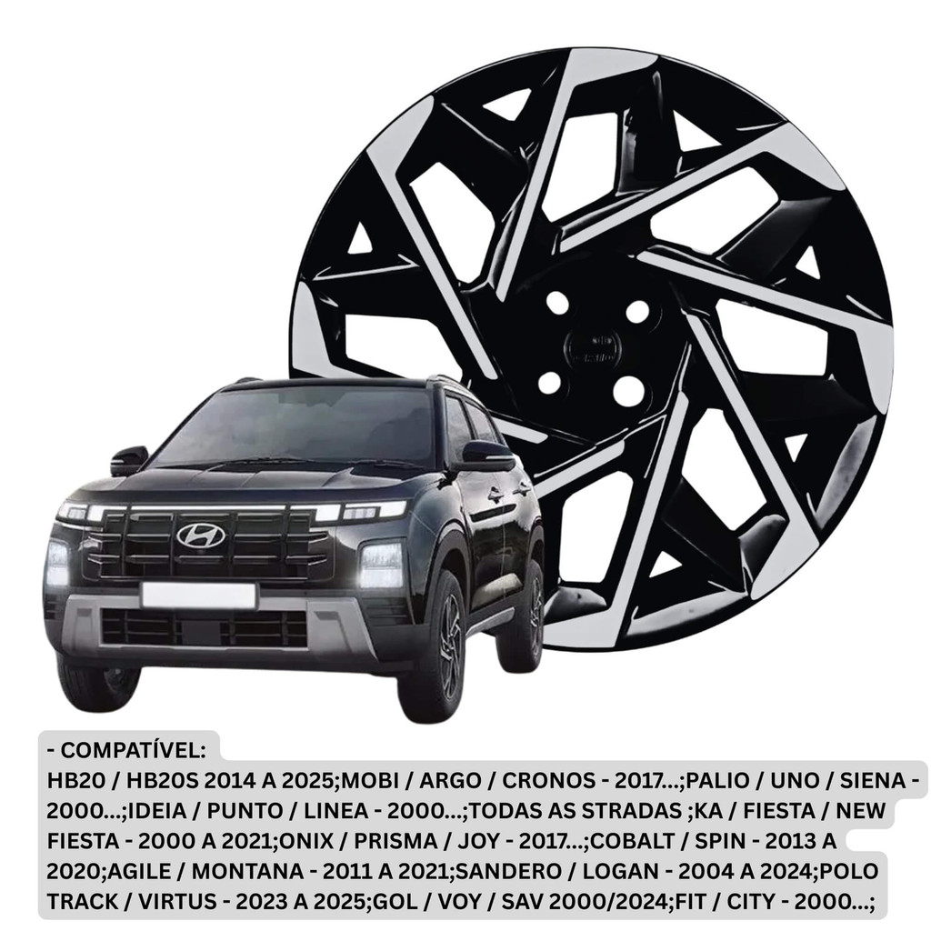 Calota Aro 15" Preto/Prata Modelo Sport Creta 2025 Jogo c/4 Calotas Grid - 205CP-PBP-E