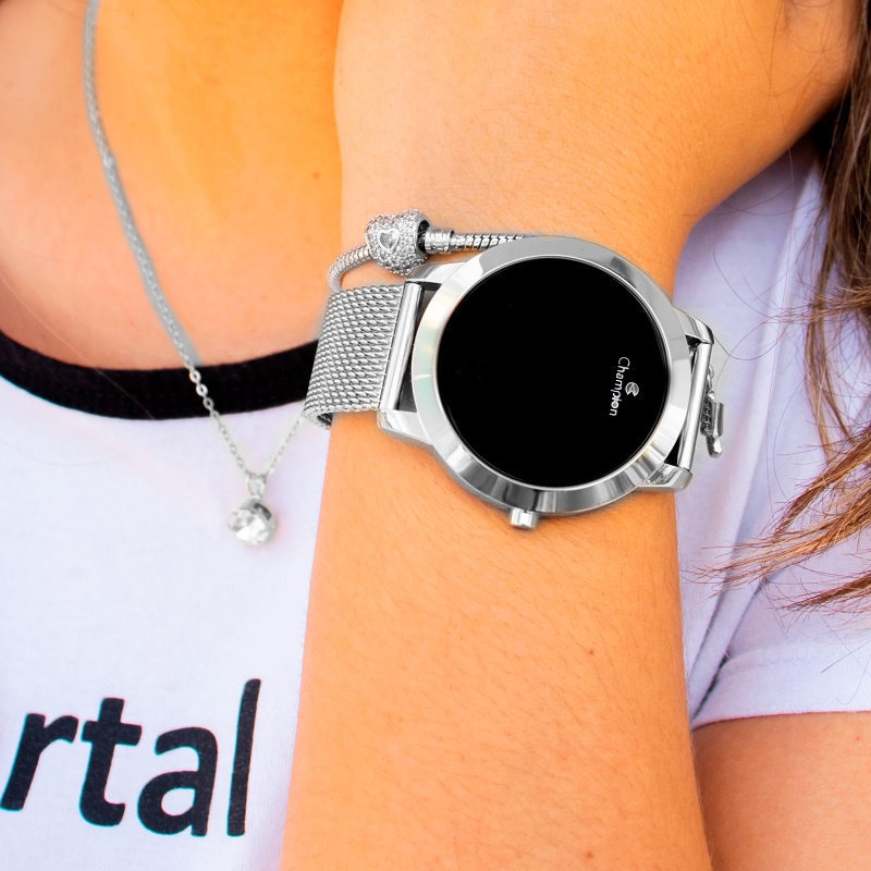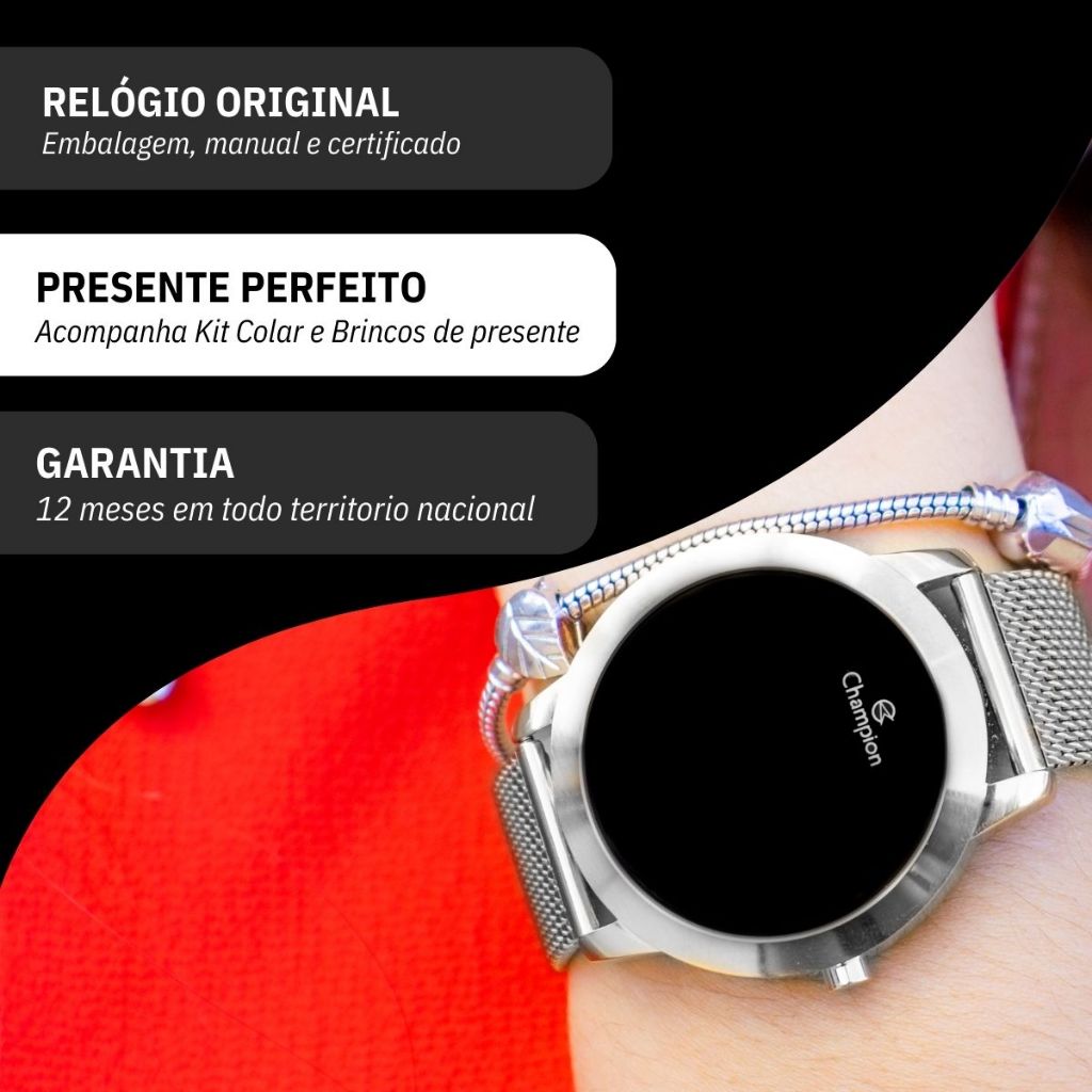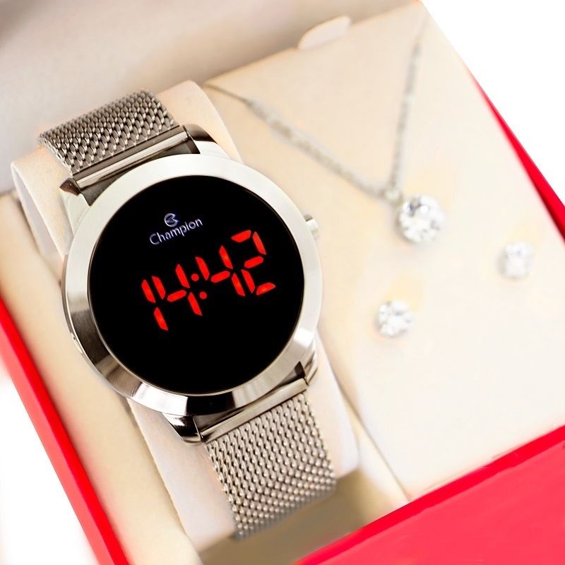 Relógio Champion CH40106T: feminino, digital LED, prata/vermelho, com colar e brincos. Presente bonito e à prova d'água.