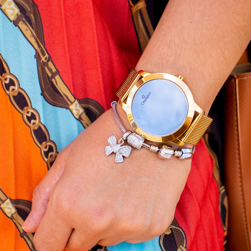 Relógio Champion Feminino Digital Espelhado Dourado Mesh + Kit Colar e Brincos Original CH40106B