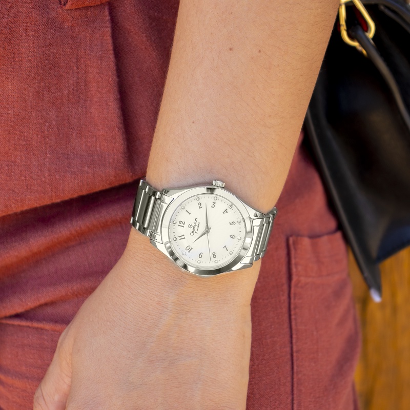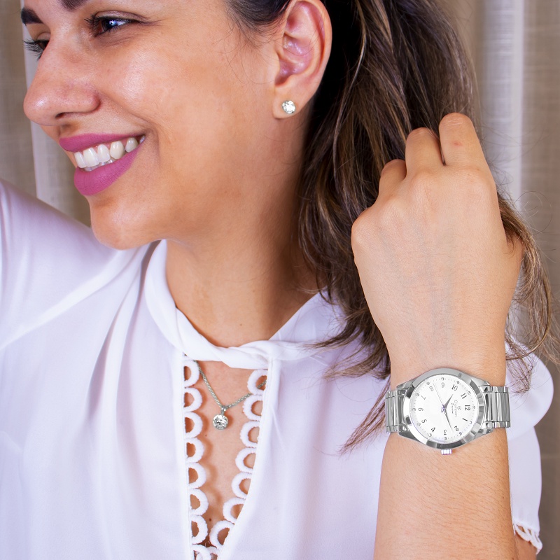 Relógio Champion Feminino Analógico Prata + Kit Colar e Brincos Original À Prova D'Água Mulher Barato CN29409Q