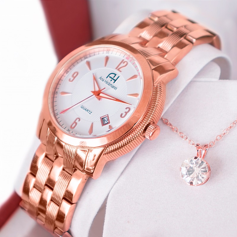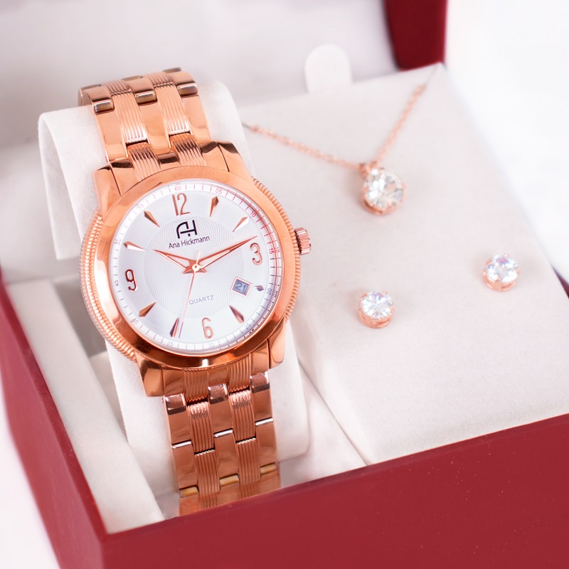 Relógio Champion Ana Hickmann Feminino Analógico Rosé + Kit Colar e Brincos Prova d'Água AH28697Z