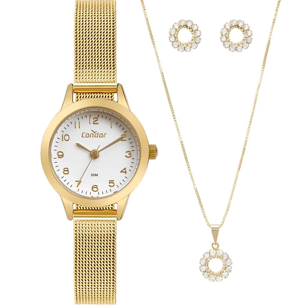 Relógio de Pulso Feminino Condor Dourado Analógico Original Colar e Brincos Presente CO2035MZS/K4K