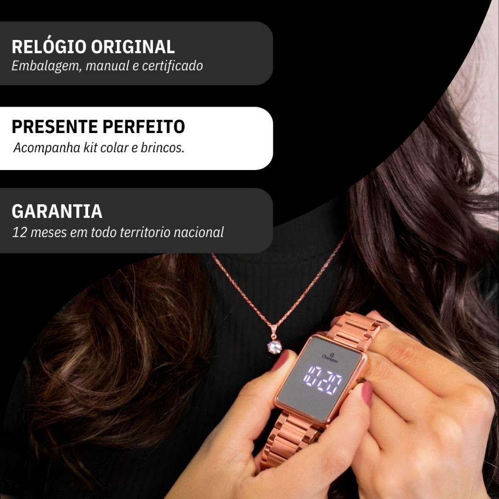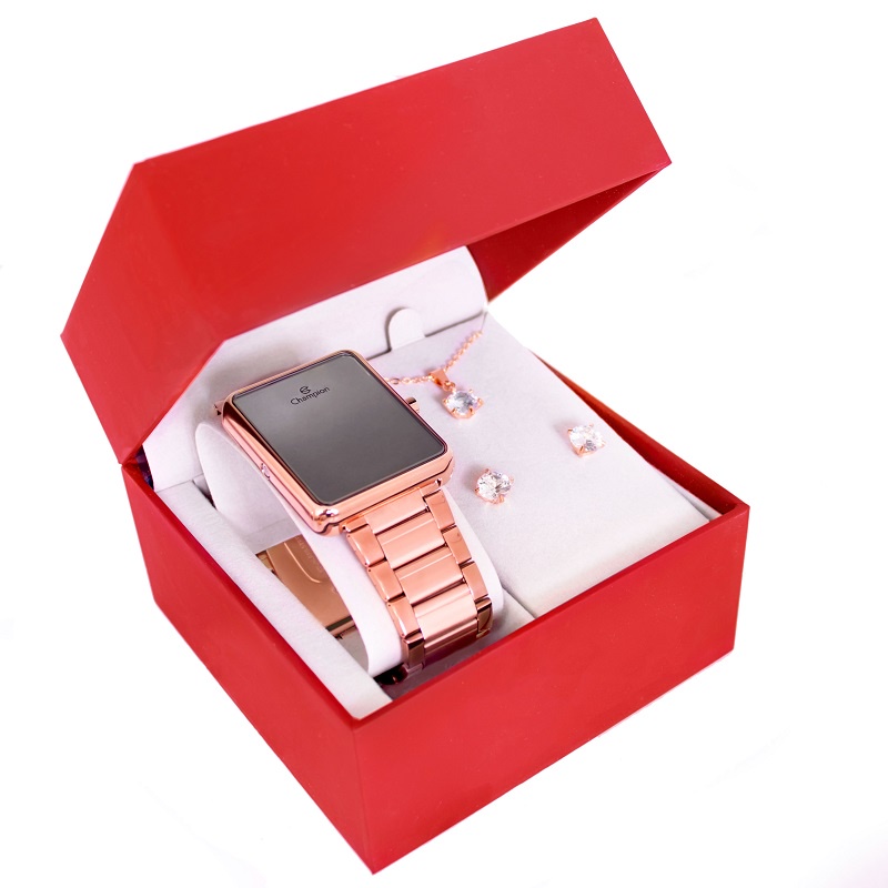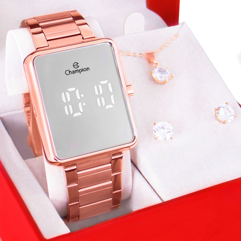 Relógio Champion Feminino Digital Rose Espelhado + Kit Colar e Brincos CH40086Z