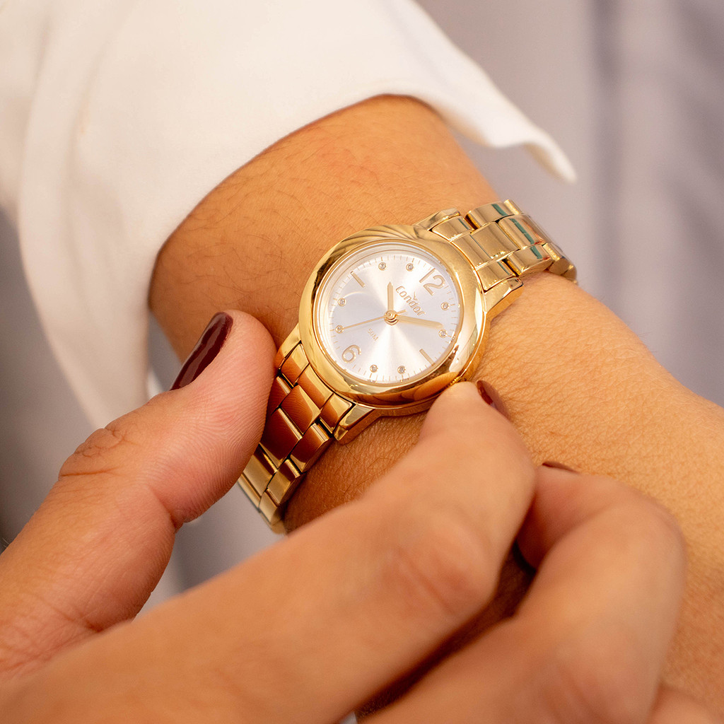 Relógio de Pulso Feminino Pequeno Condor Dourado Colar e Brincos Resistente a Água CO2035NMPK4