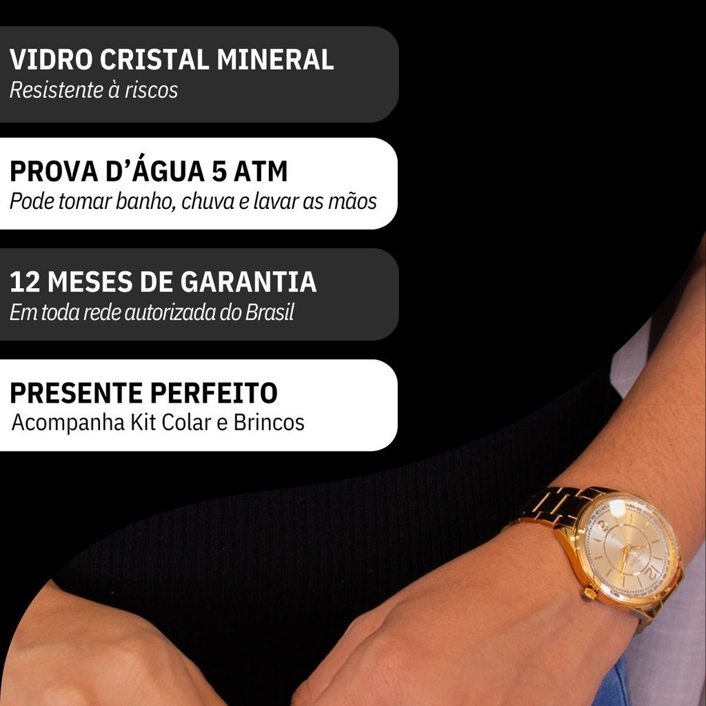 Relógio de Pulso Feminino Condor Dourado Analógico à Prova D'Água Colar e Brincos COPC21JLD/K4X