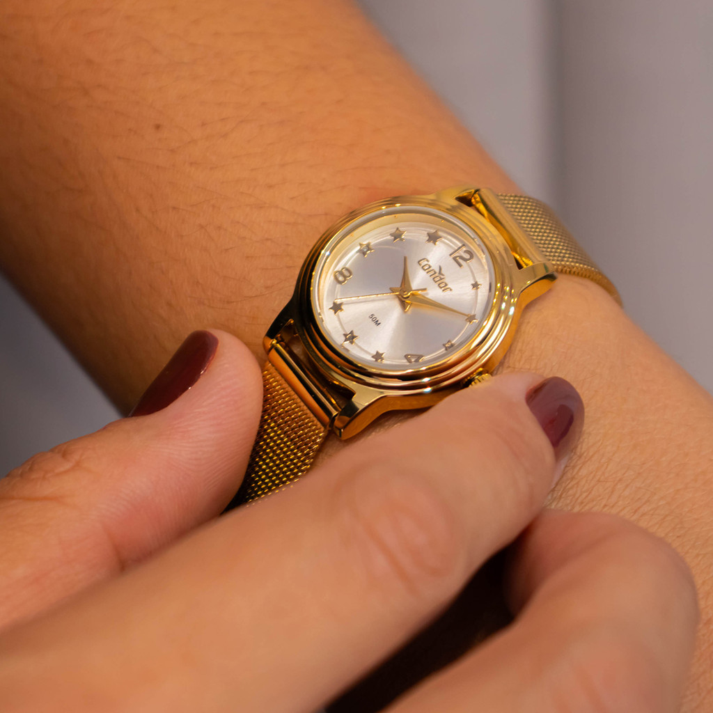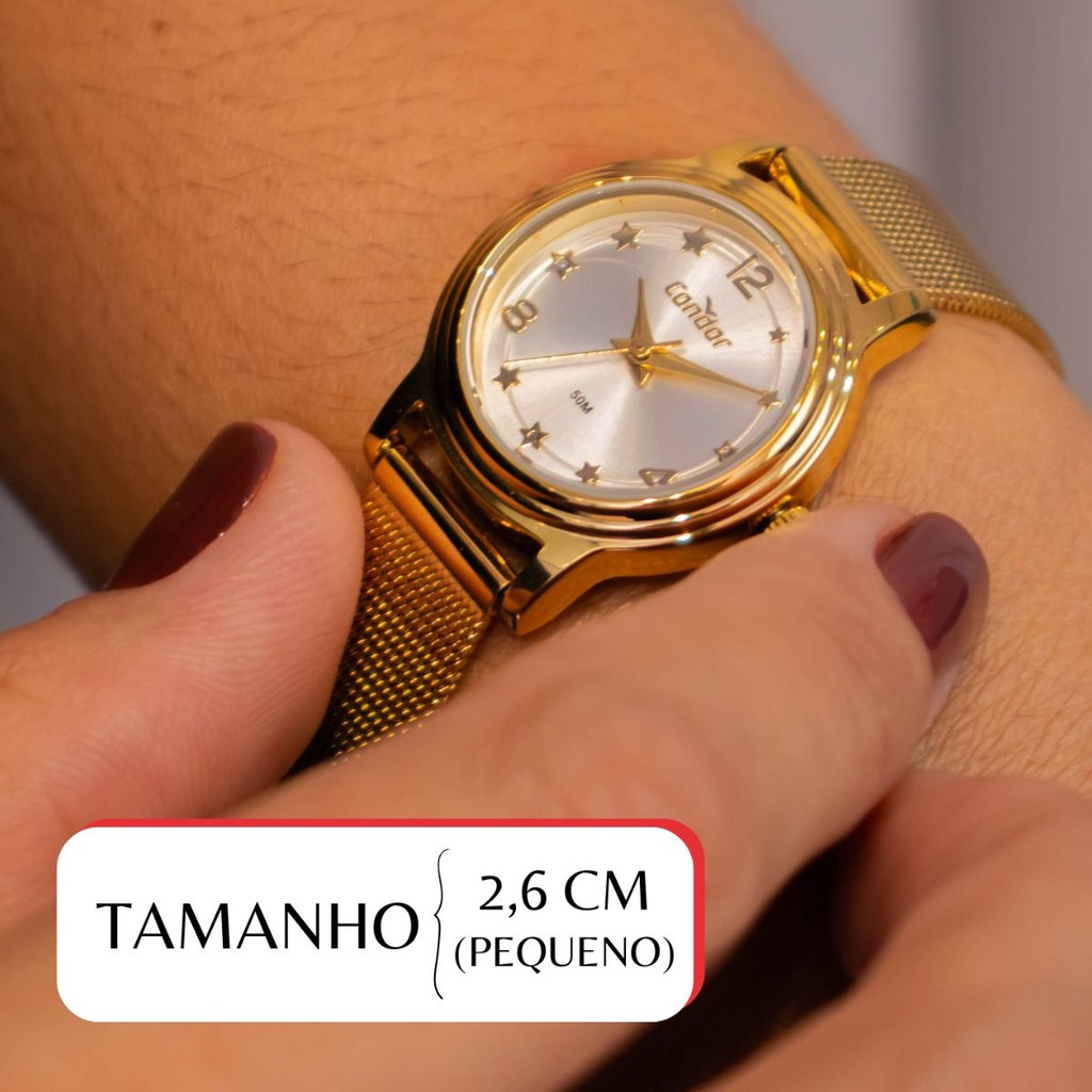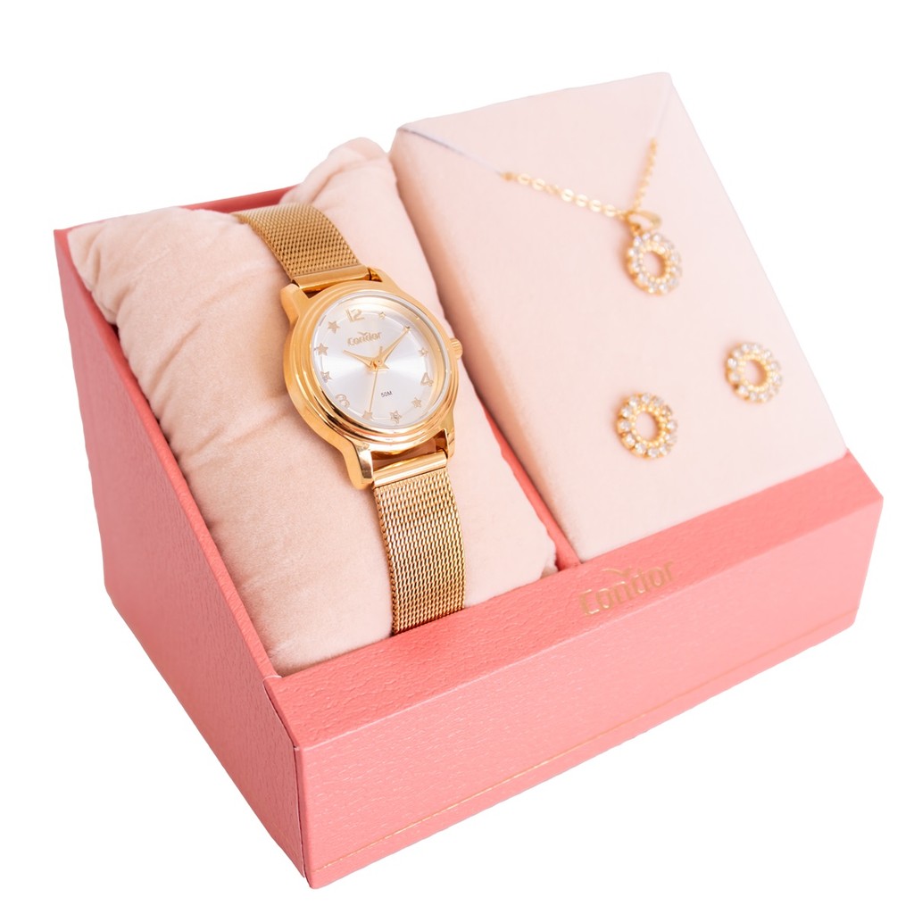 Relógio de Pulso Feminino Pequeno Condor Dourado CO2035NEN/K4D Colar e Brincos