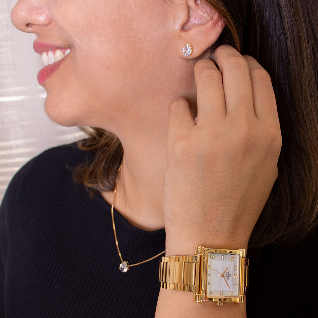 Relógio Champion Feminino Quadrado Dourado + Kit Colar e Brincos Original À Prova D'Água CN25369W