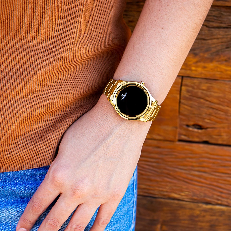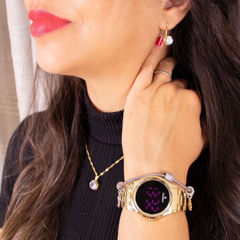 Relógio Champion Feminino Digital Dourado + Kit Colar e Brincos Original À Prova d'Água Mulher Namorada Barato CH48019H