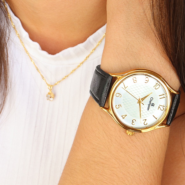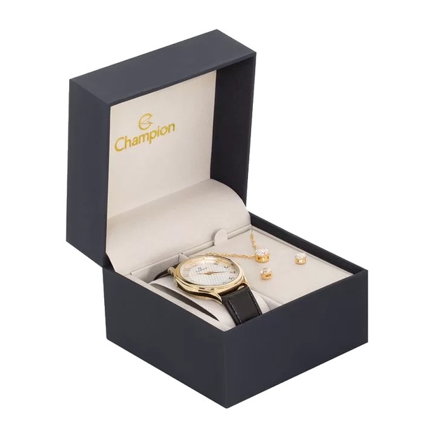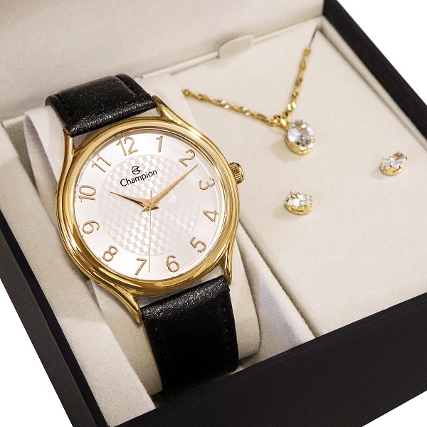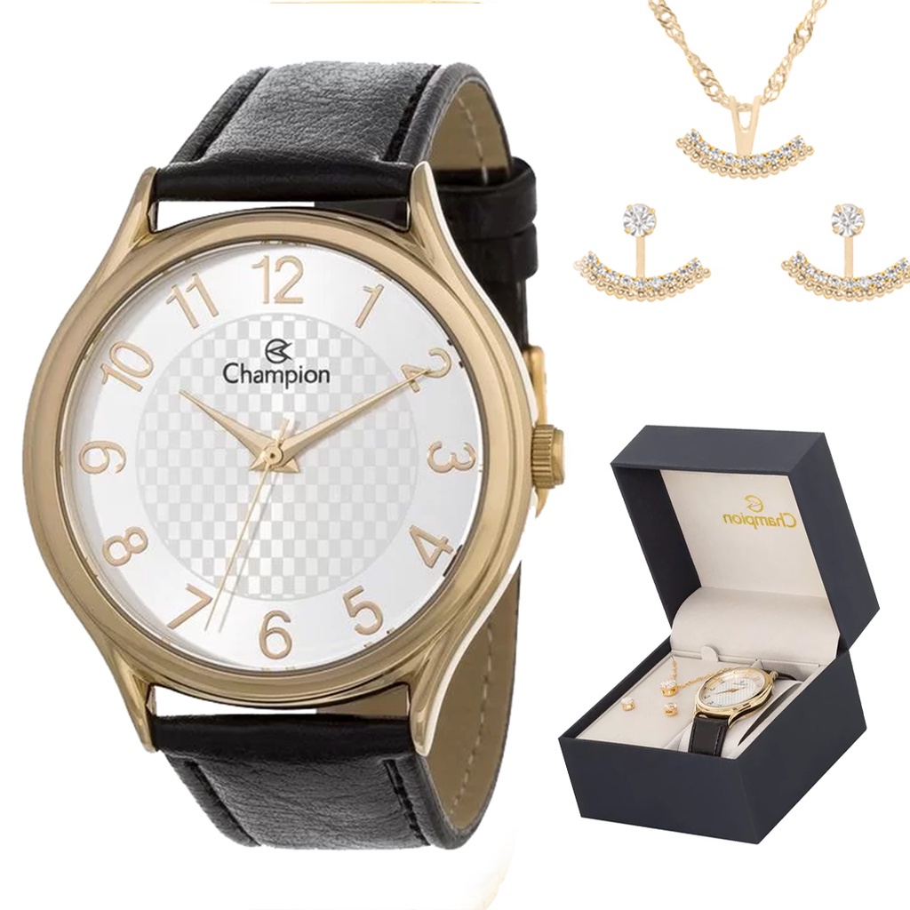 Relógio Champion Feminino Analógico Dourado Couro + Kit Colar e Brincos Original À Prova D'Água Mulher Barato CH22706W