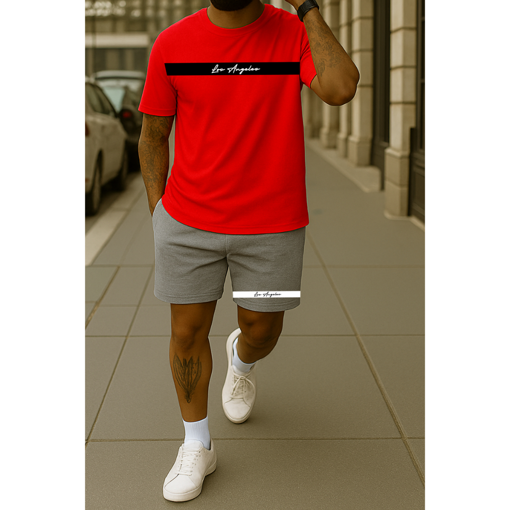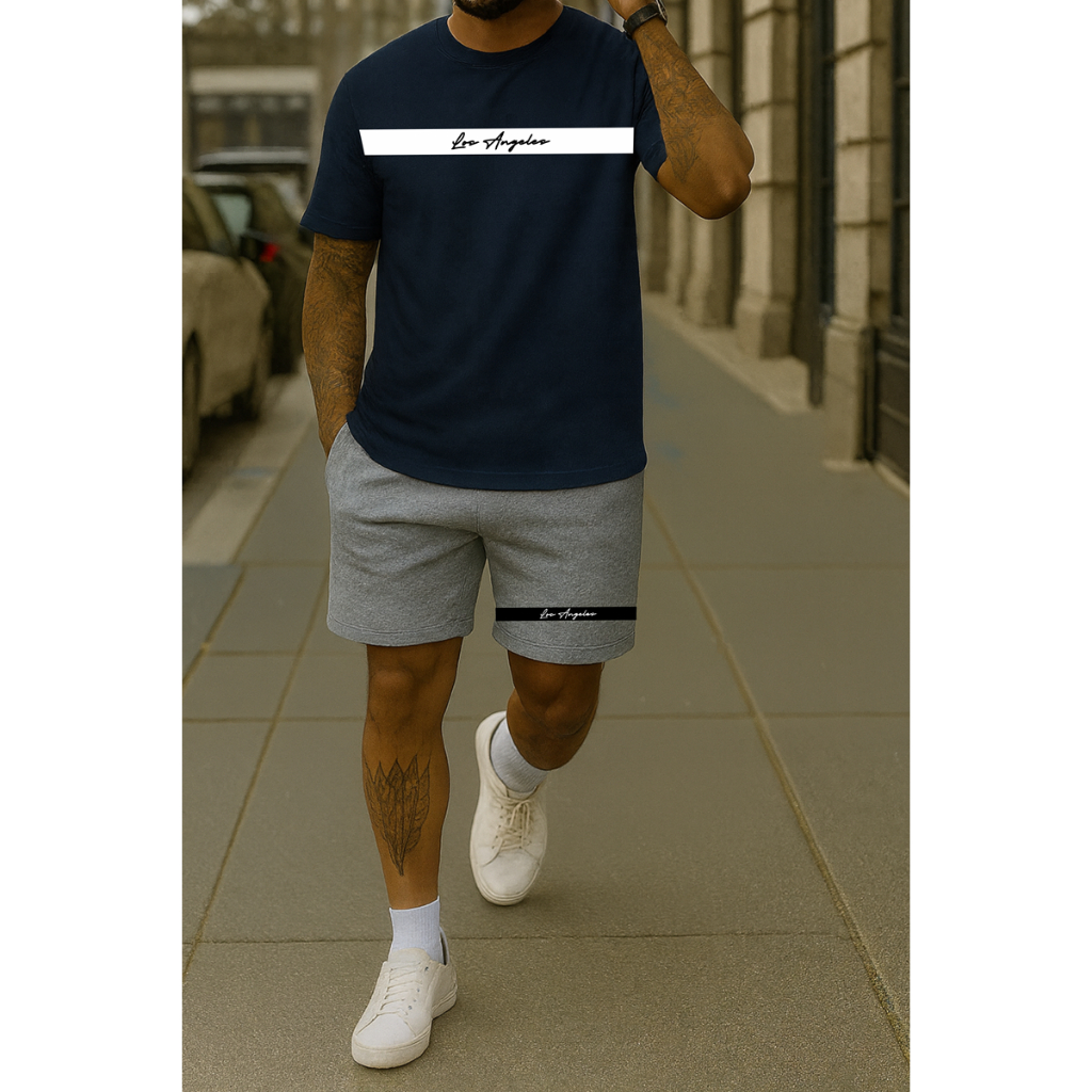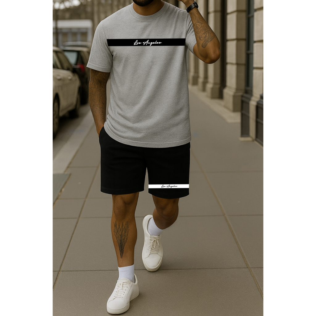 Kit Camiseta Longline e Short Moletim Los Angeles Masculino Bermuda Slim Streetwear