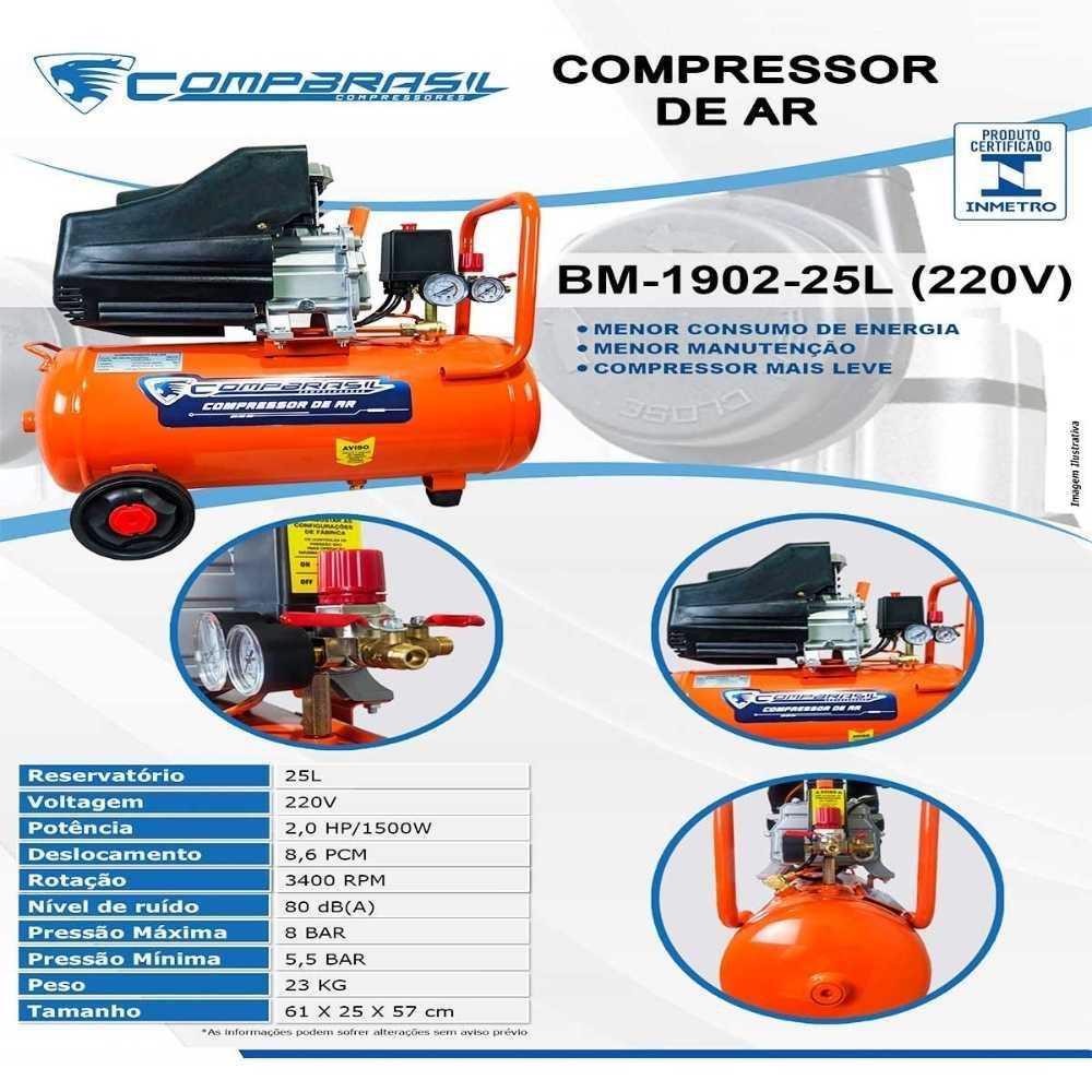 Compressor Portátil 2HP 25L Lubrificado COMPBRASIL com Kit para Compressor 6 Peças FERRARI