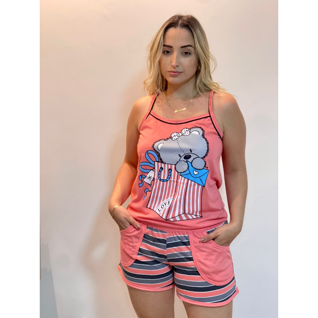 Pijama Baby Doll com Alcinha, feminino estampado e com bolso, Short doll em malha