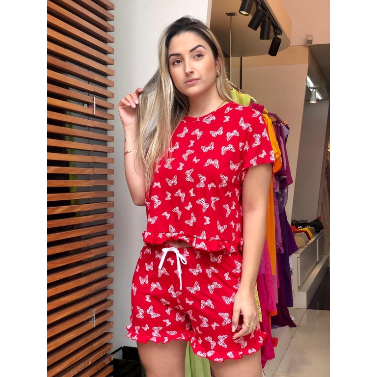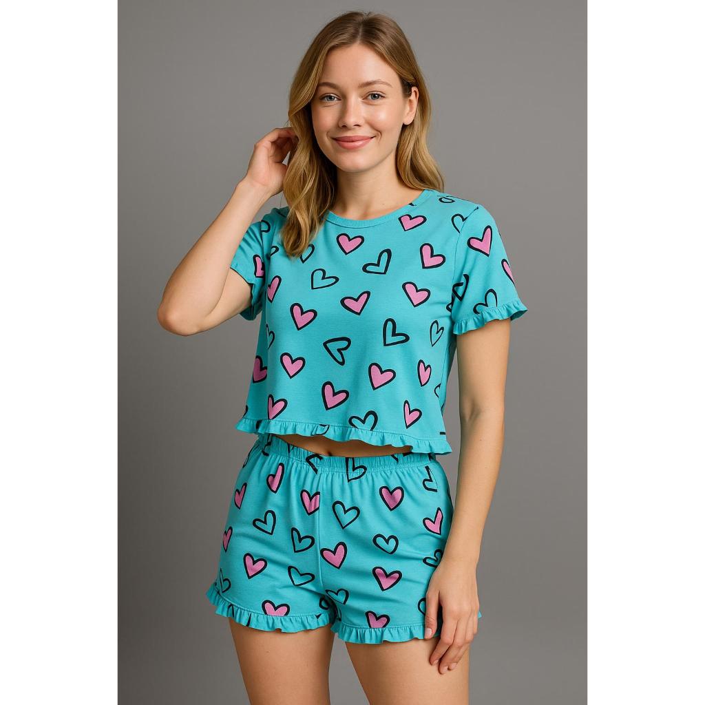 Pijama Feminino Manga Curta Com Babado Estampado Baby Doll Conjunto Verão Manga Curta e Short