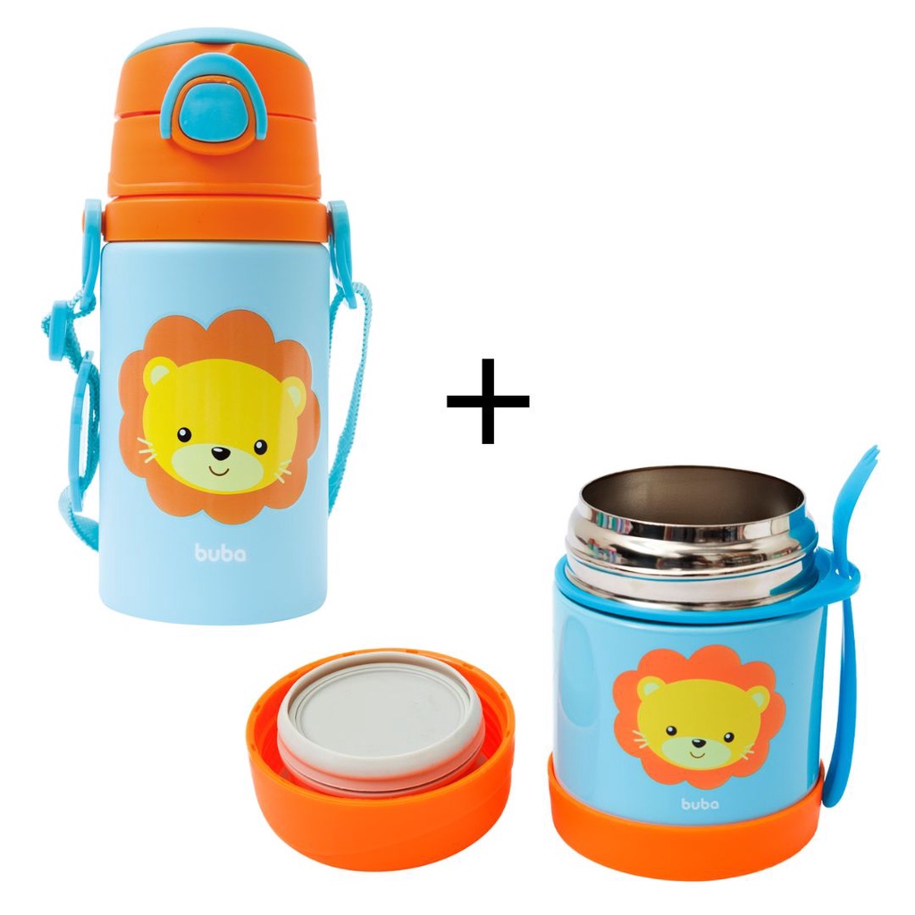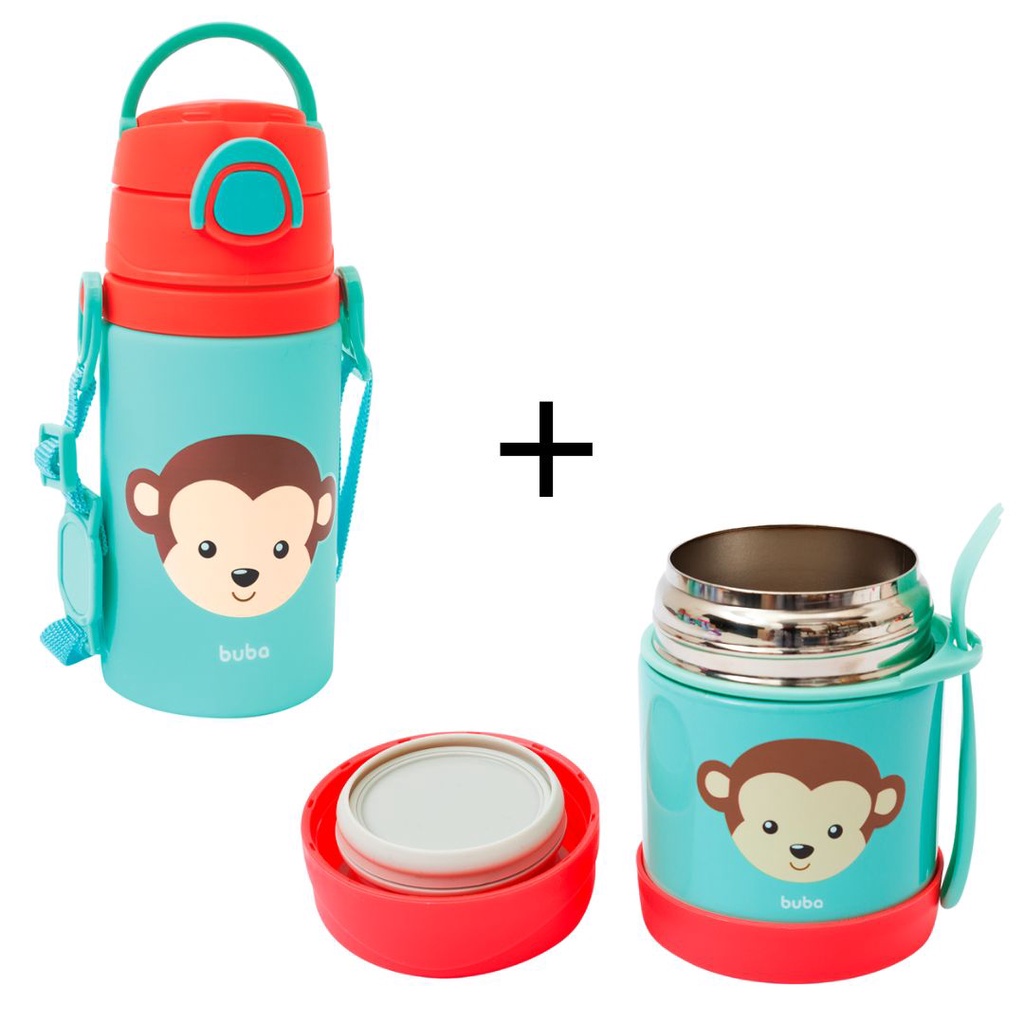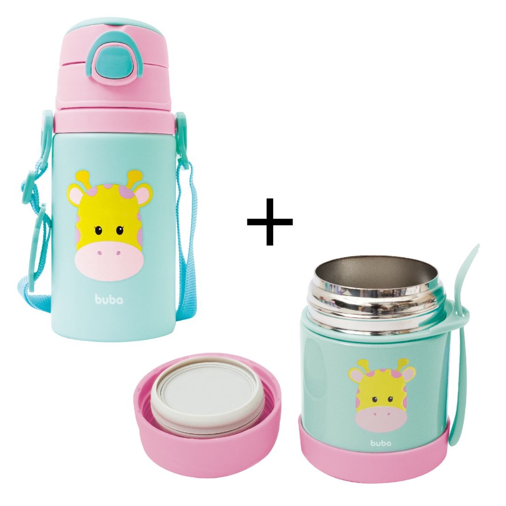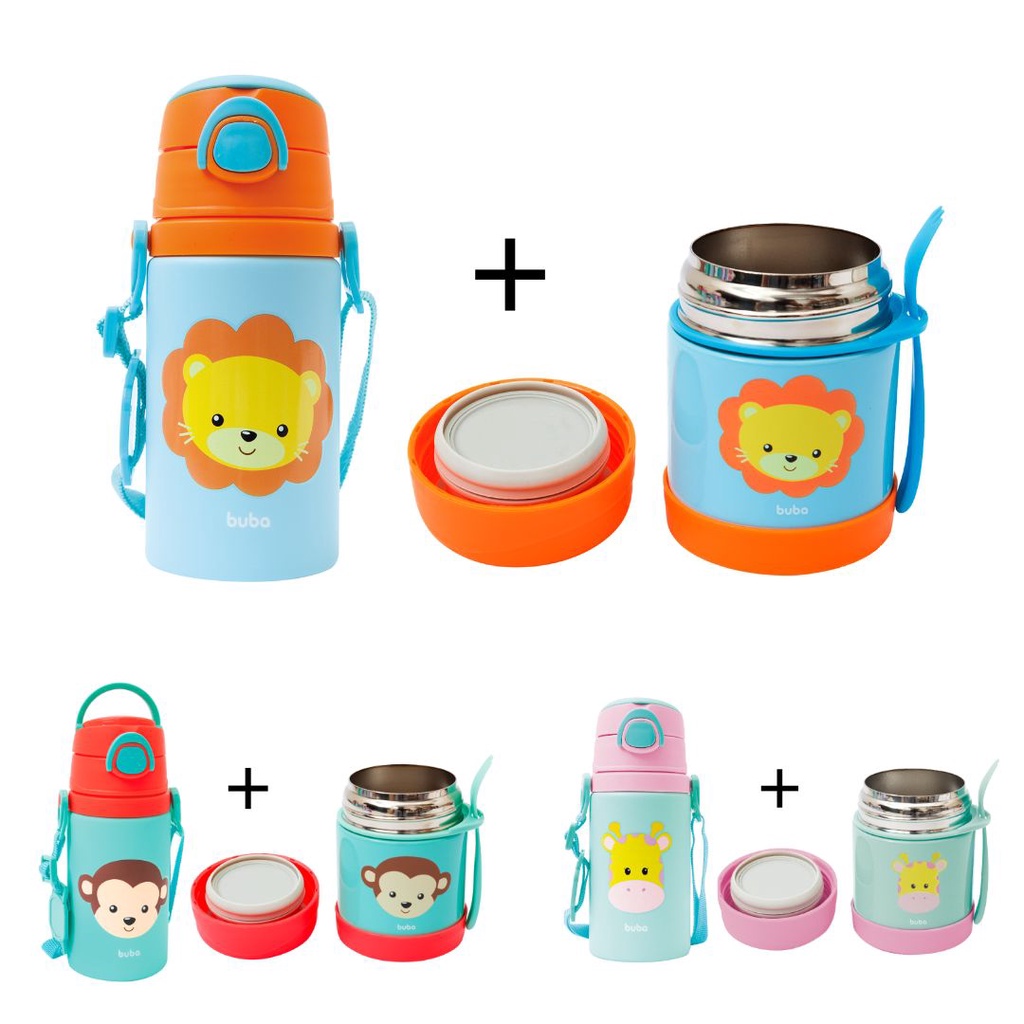 Kit Pote Térmico C/ Talher + Garrafinha C/ Canudo de Silicone Infantil Buba