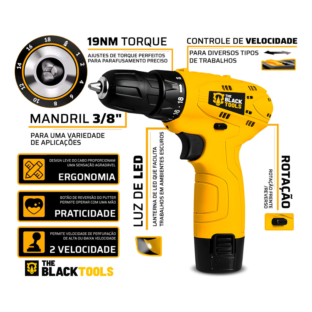 Parafusadeira E Furadeira 3/8 12v A Bateria Profissional Bivolt The Black Tools