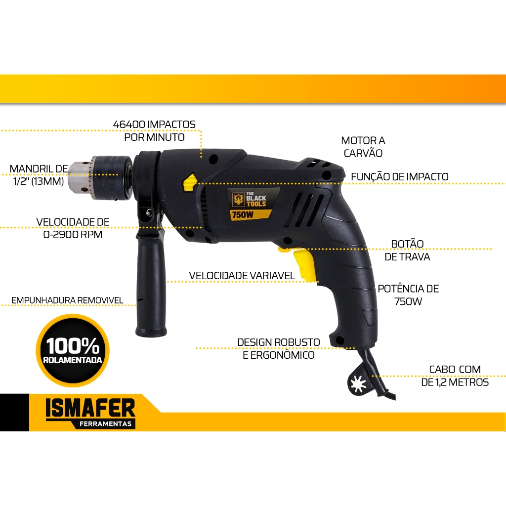 Furadeira De Impacto 13mm 1/2 Pol 750w Profissional The Black Tools