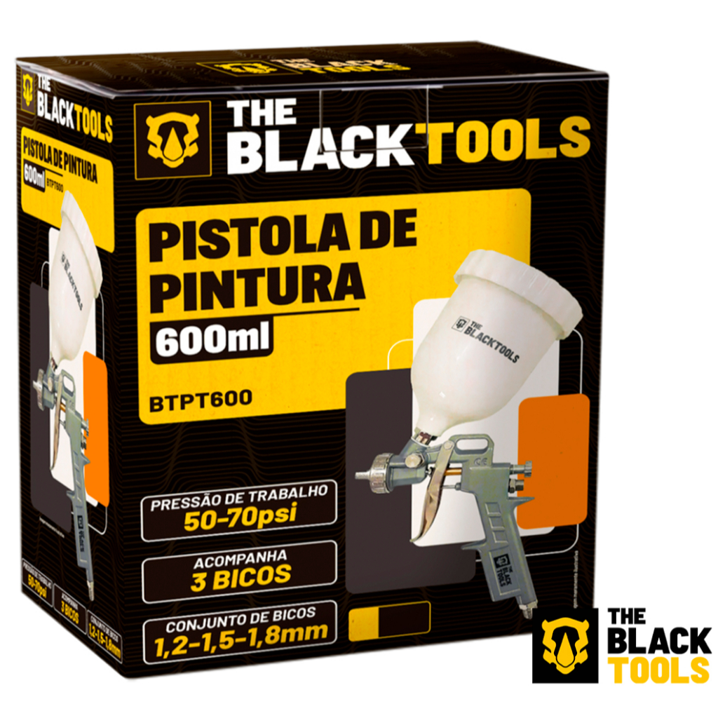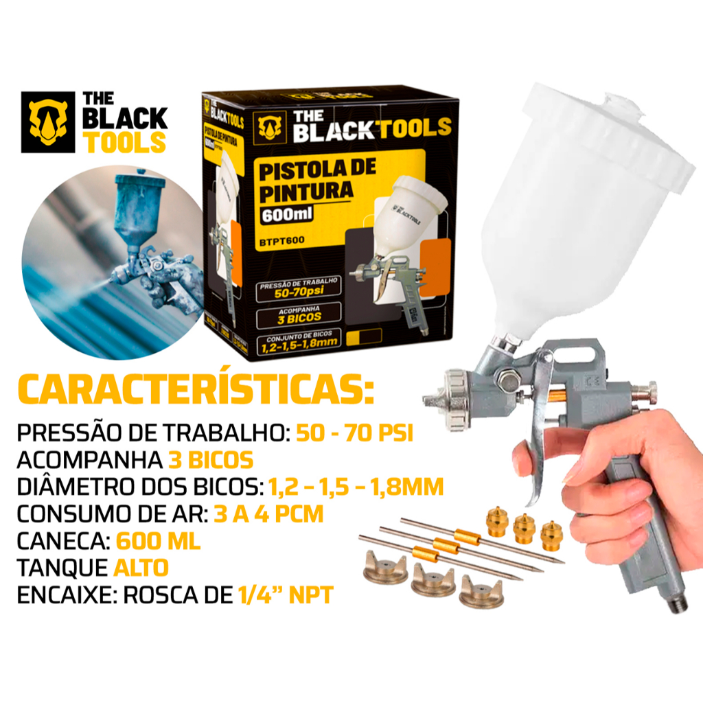 Kit 2 Pistola Pintura Gravidade 600ml + 3bicos 1.2 1.5 1.8mm The Black Tools