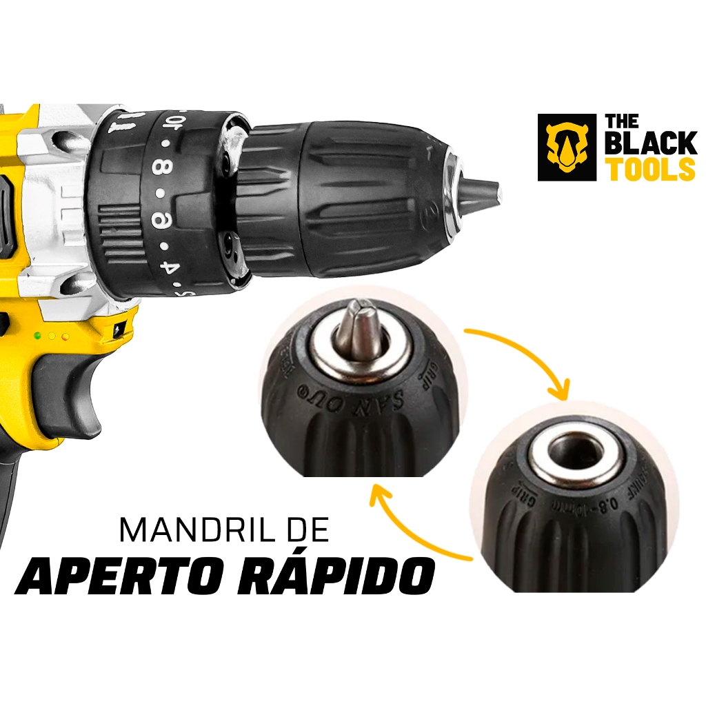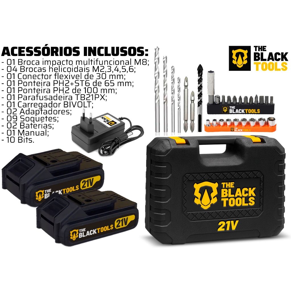Furadeira Parafusadeira Sem Fio 21v 10mm Maleta The Black Tools + Acessórios