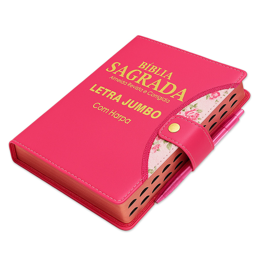 Bíblia Sagrada Letra Jumbo - Botão Pink - C/ Harpa - 16x25cm
