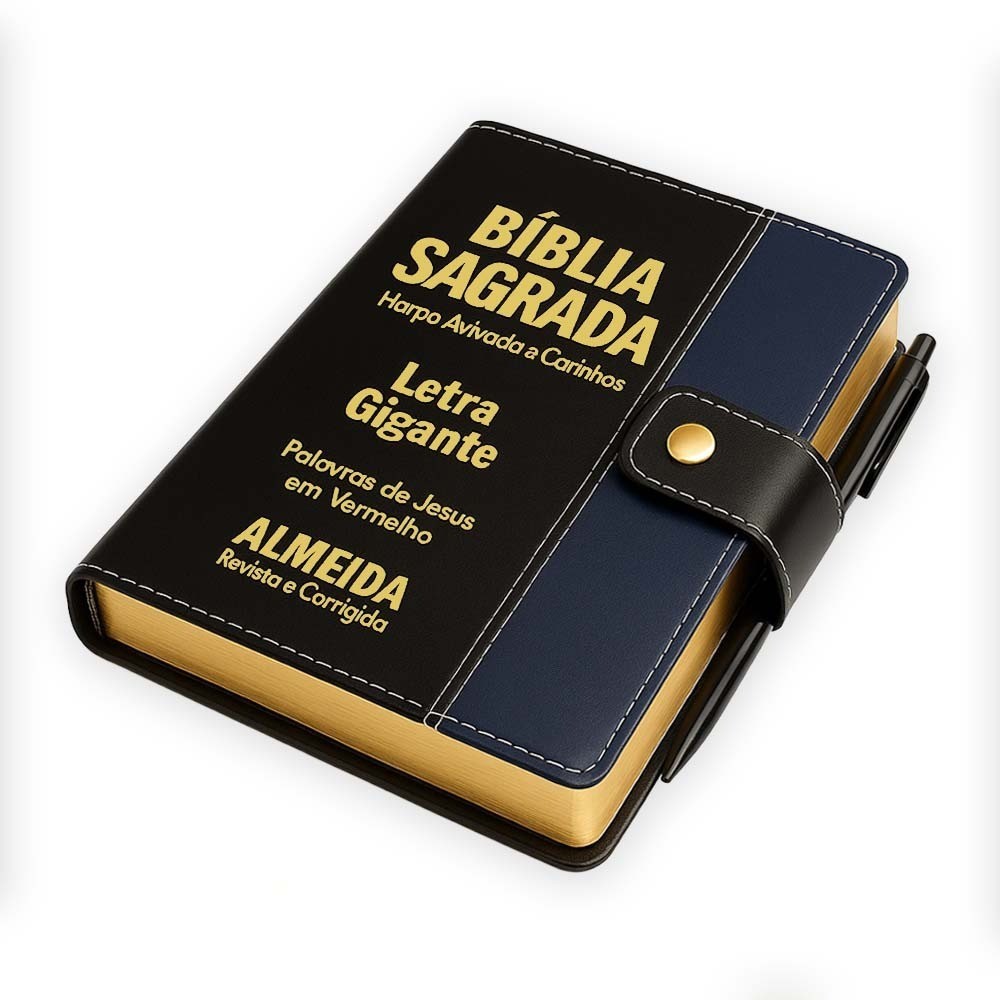 Bíblia Sagrada Letra Gigante - Preto C/ Azul - Botão e Caneta Revista e Corrigida - Com Harpa