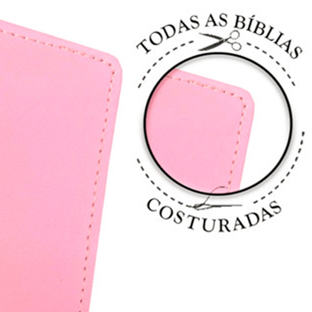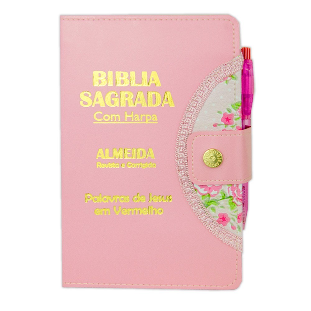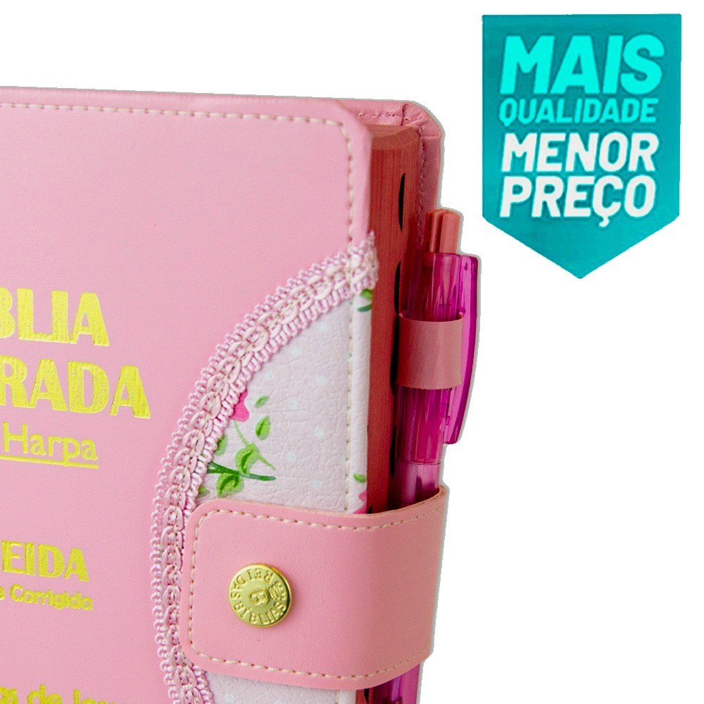 Bíblia Sagrada Letra Grande - Rosa - Botão e Caneta Revista e Corrigida - Com Harpa-