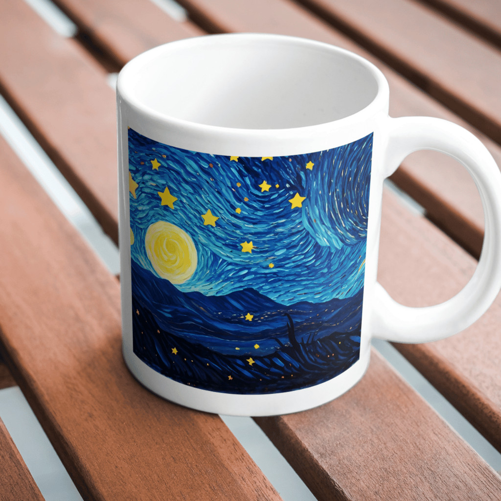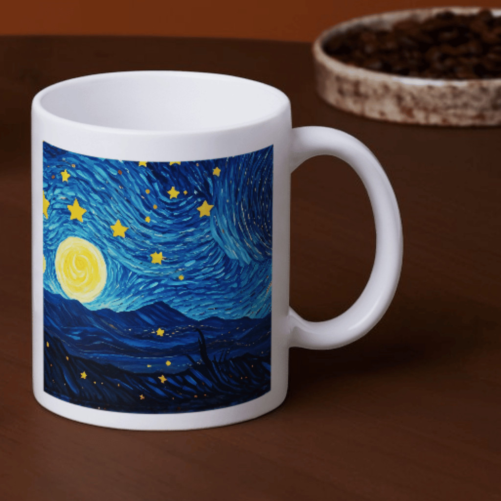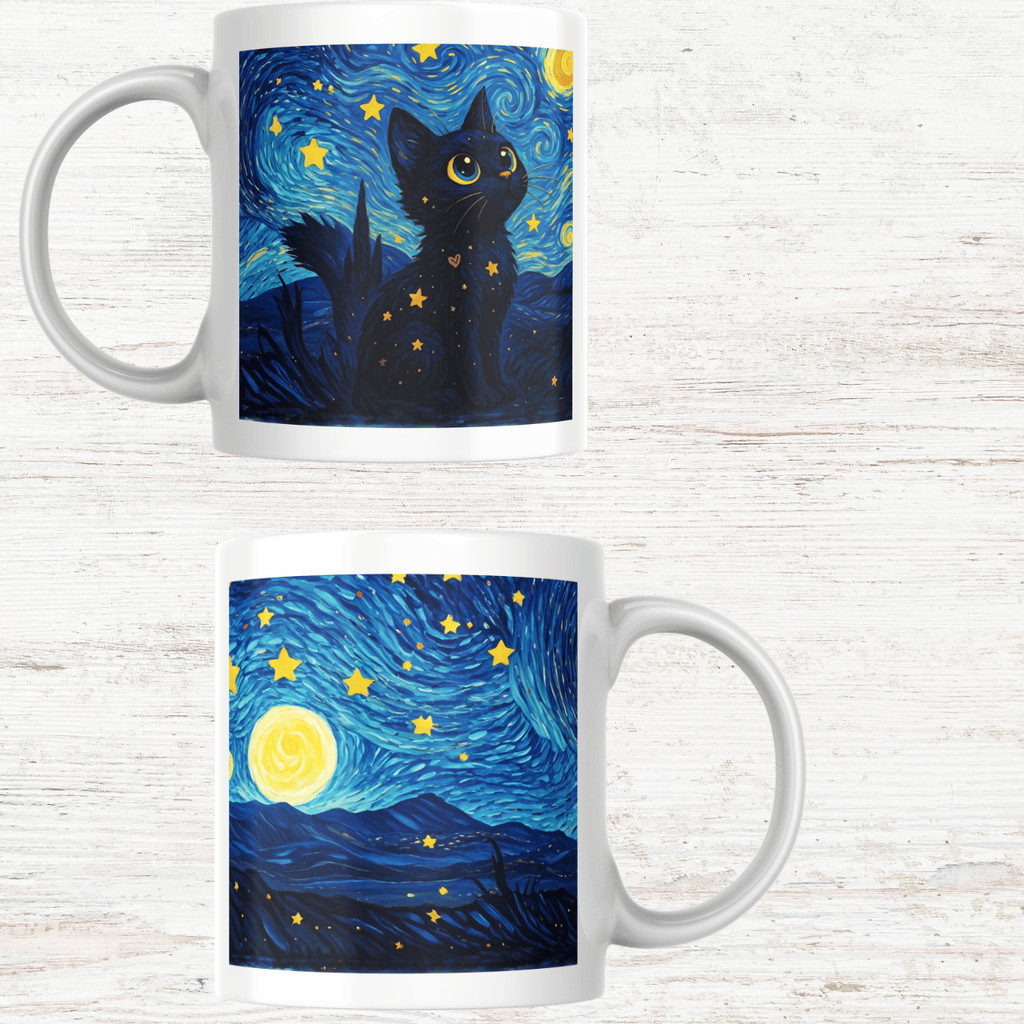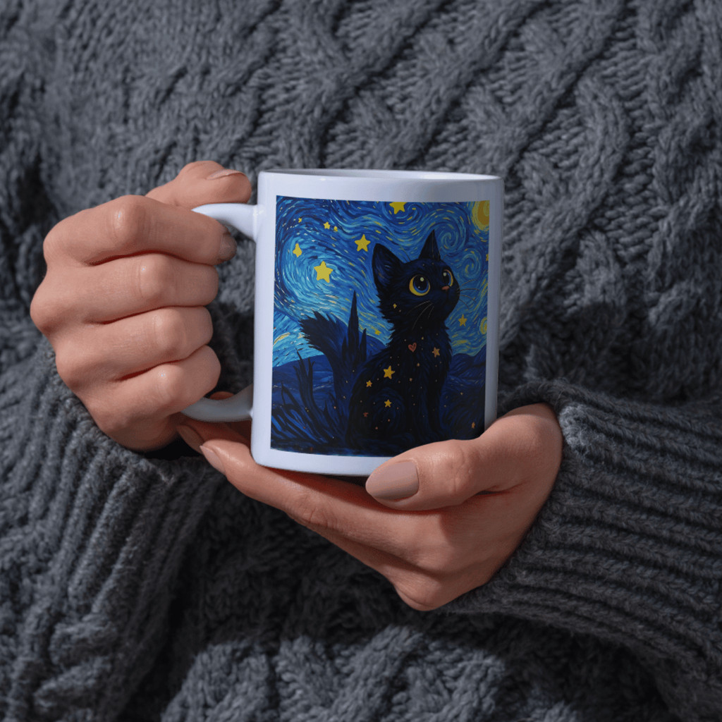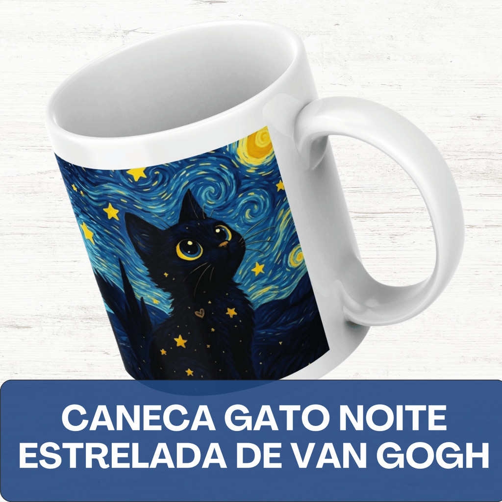 Caneca Porcelana Gato Noite Estrelada — Estampa inspirada em Van Gogh | Presente para Amantes de Gatos e Arte
