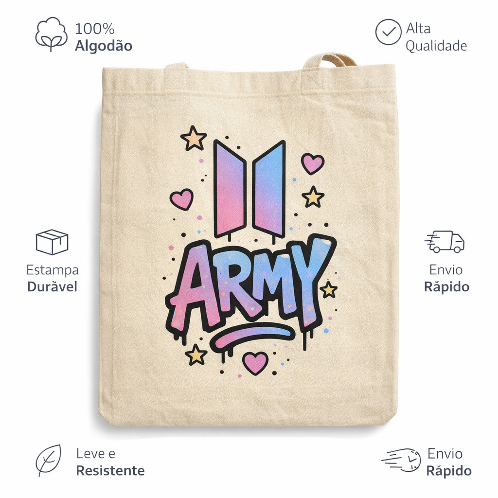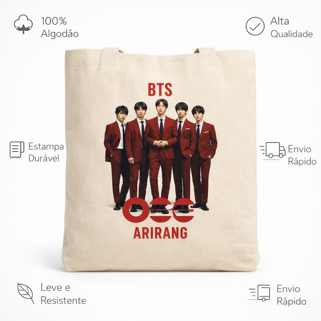 ECOBAG ESTAMPADA TEMA BTS GRUPO -100% algodão cru, 32X38, ALÇA REFORÇADA