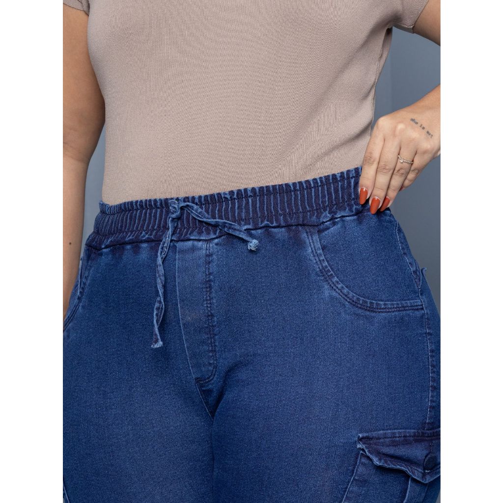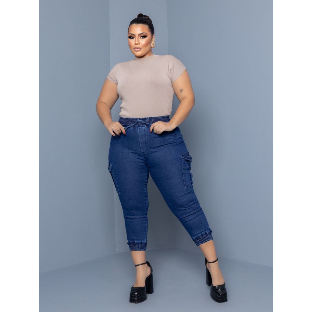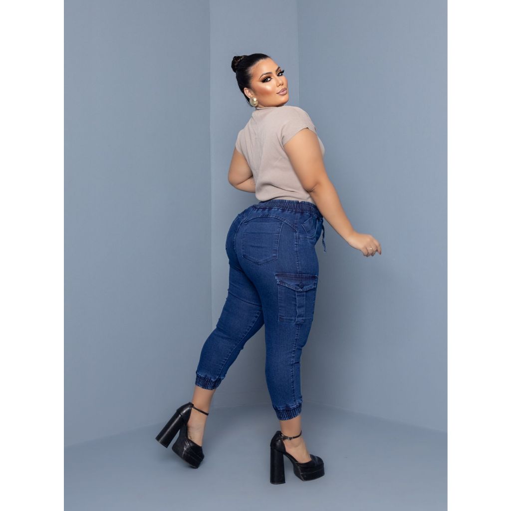 calça jeans feminino plus size jogger cargo com elastano strech empina bumbum top de linha