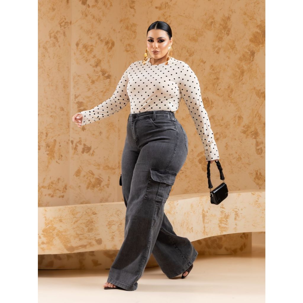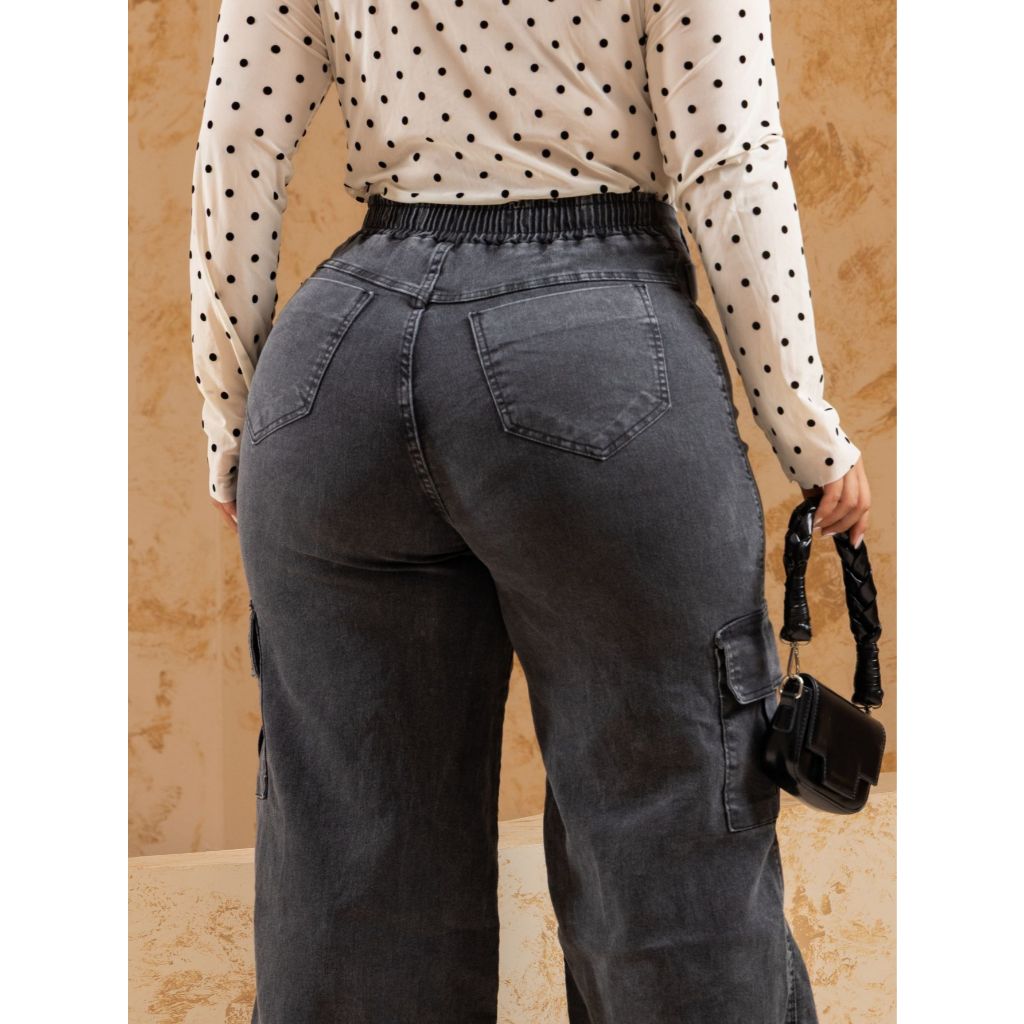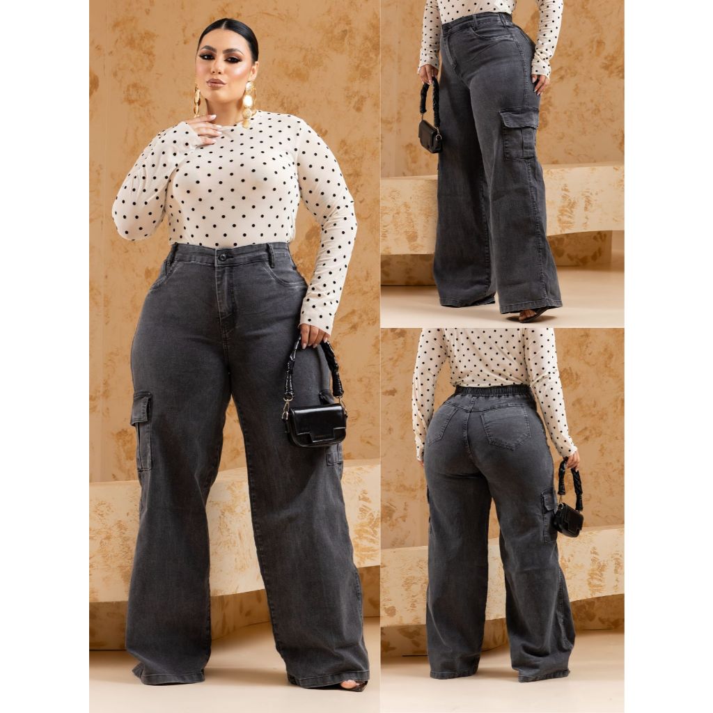 calça jeans feminina plus size wide leg vintage marmorizada cintura elástica tecido com elastano