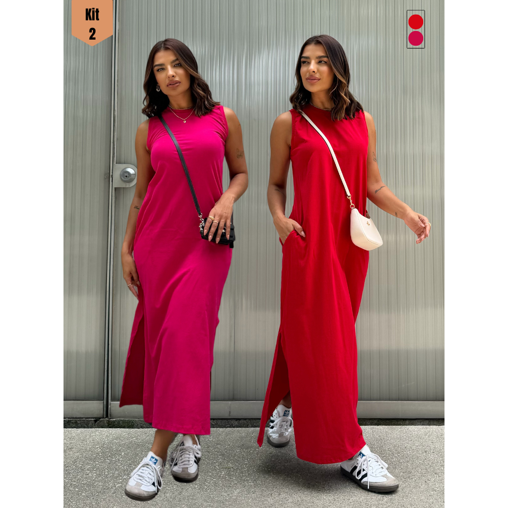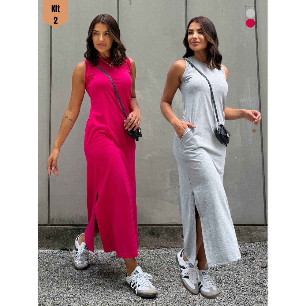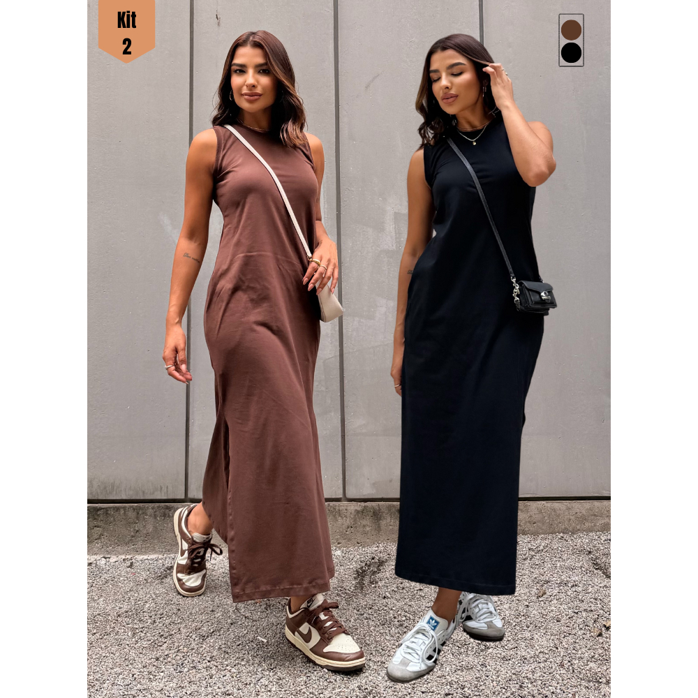 Kit 2 Vestidos Feminino Longo Soltinho Tendência Moda Blogueira Elegante Algodão