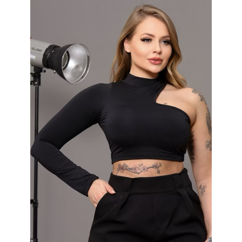 cropped ombro único detalhe lançamento verão manga longa