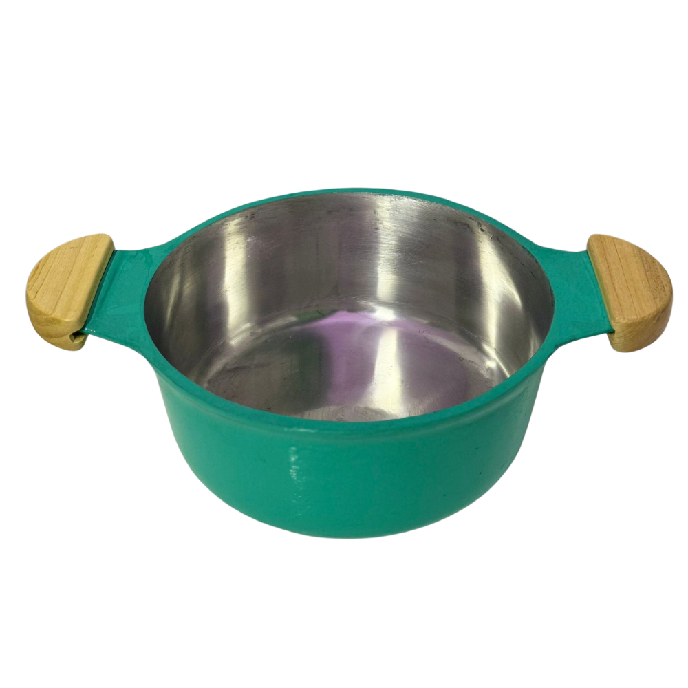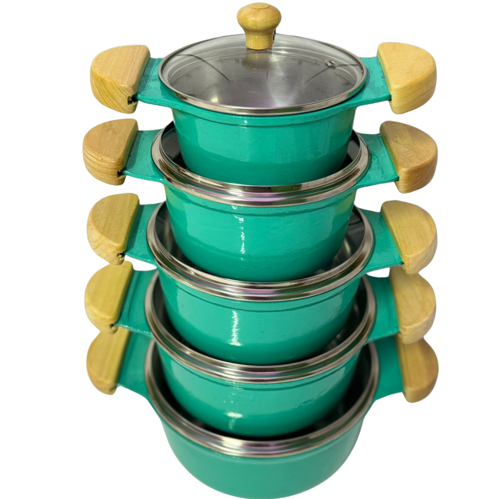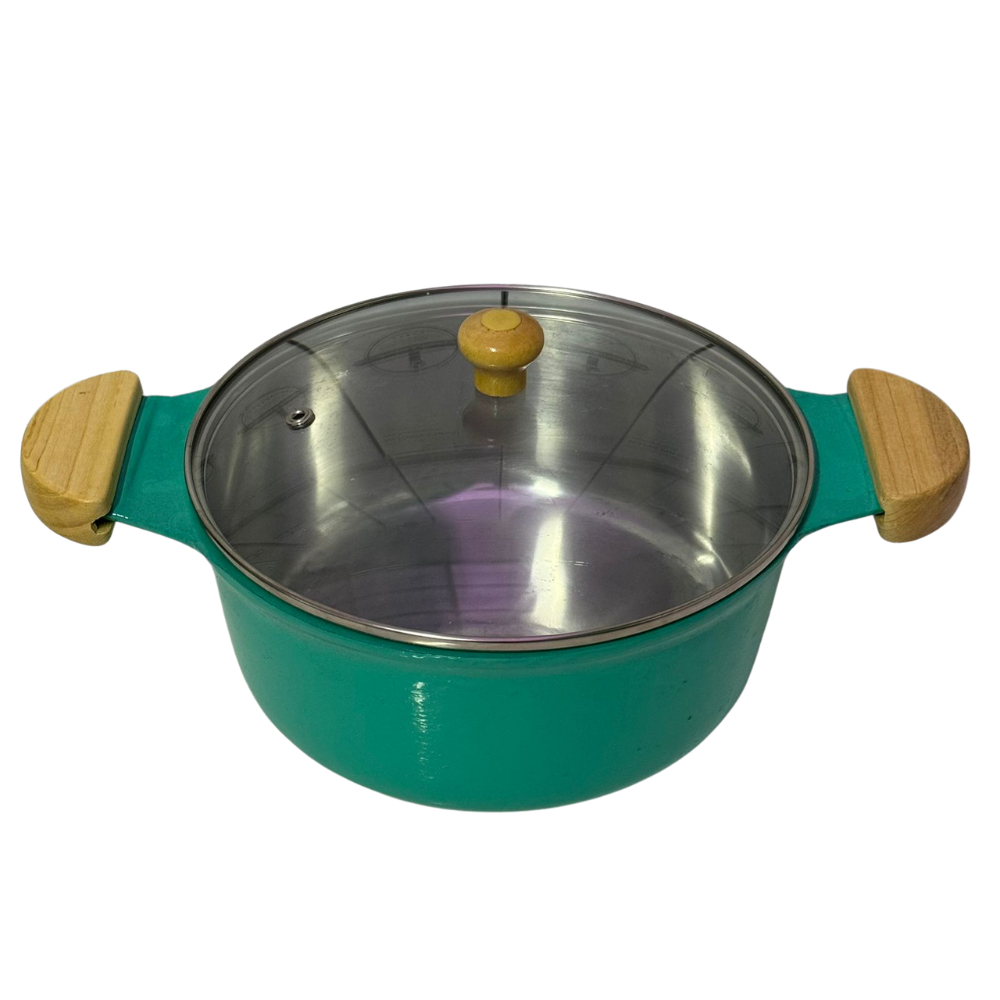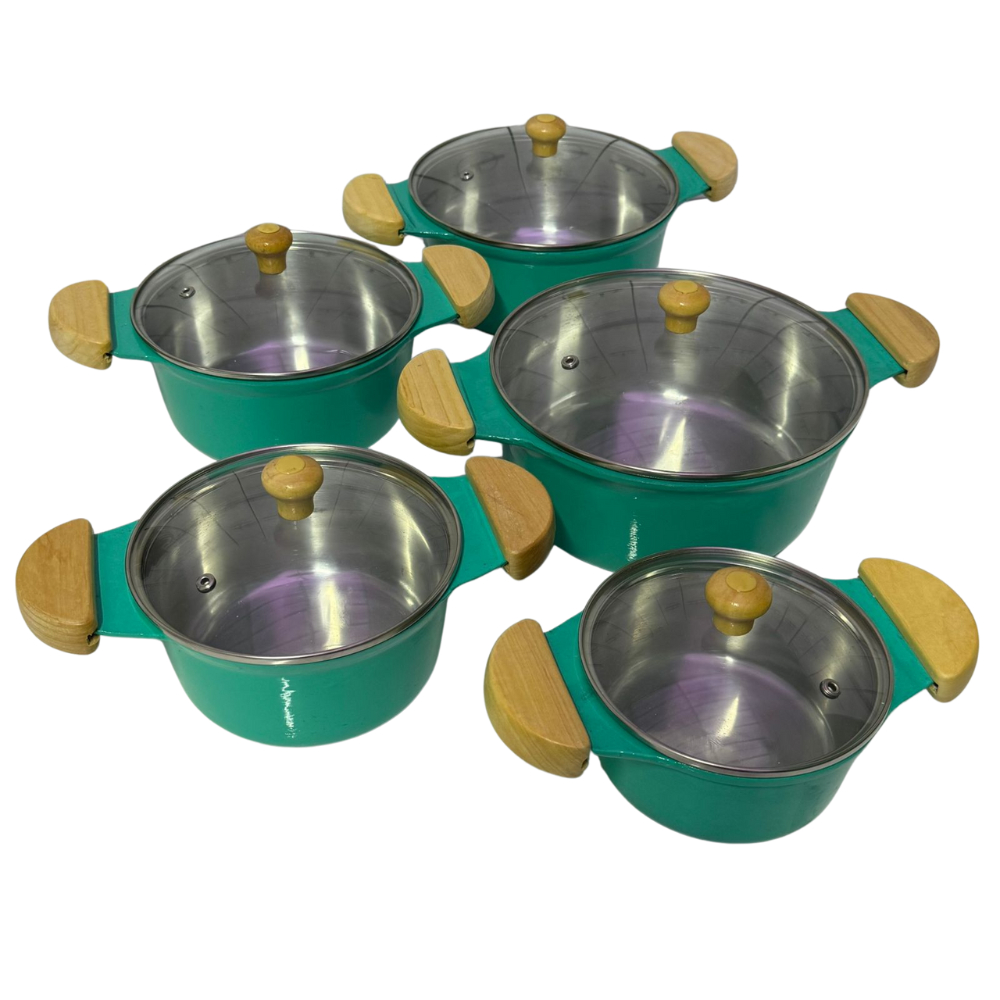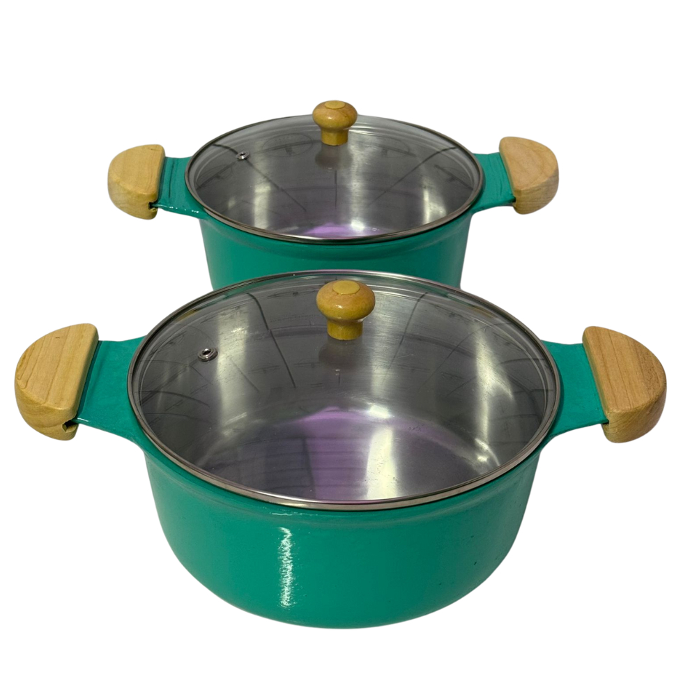 jogo de panela tampa de vidro em alumínio batido fundido grosso verde agua alça de madeira marfim