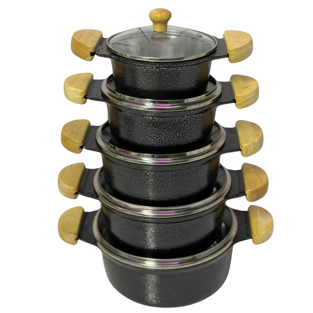 Jogo de Panelas Grossas em alumínio batido Fundido Tampa de vidro 5 peças preto craqueado