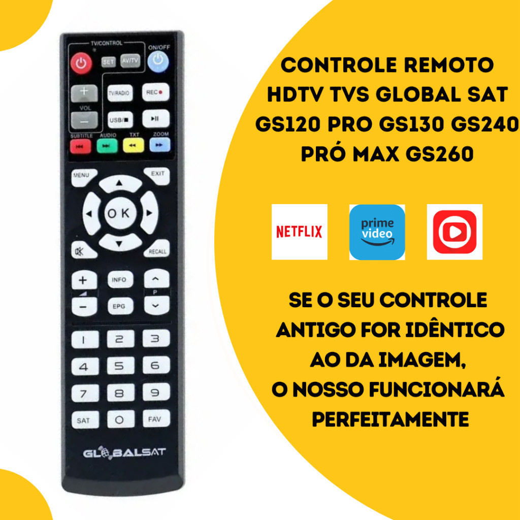 Controle Remoto Compativel GLOBAL | SAT GS 120 Pro GS 130 GS 240 Pró Max GS 260 HDTV TVs + Pilhas